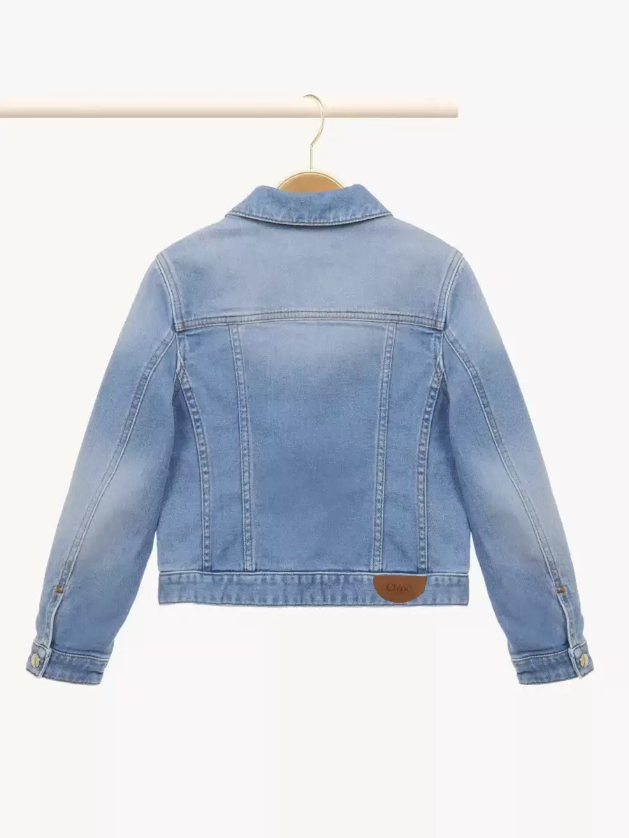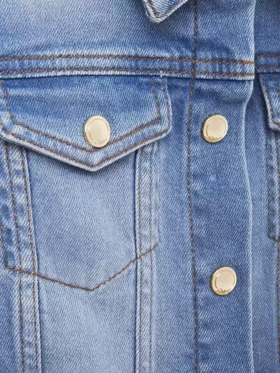 Bu pamuklu denim ceket, şehirli bir hava katmak için soluk efektli ve koyu sarı üst dikişlidir. Altın tonlu Chloé işlemeli çıtçıtlar önden geçer ve göğüs ceplerini detaylandırarak zarif bir donanım katar. Arkada bir Chloé Paris deri logo yaması bulunur.