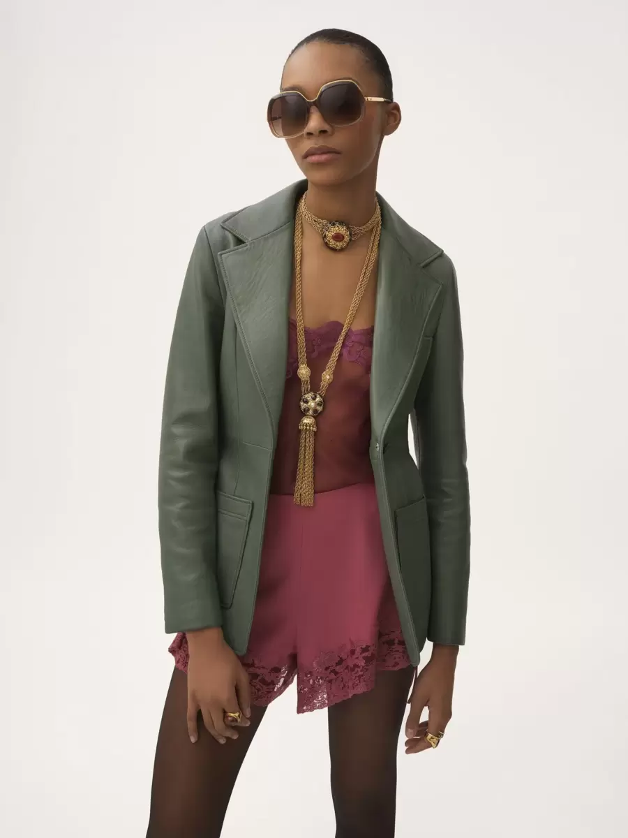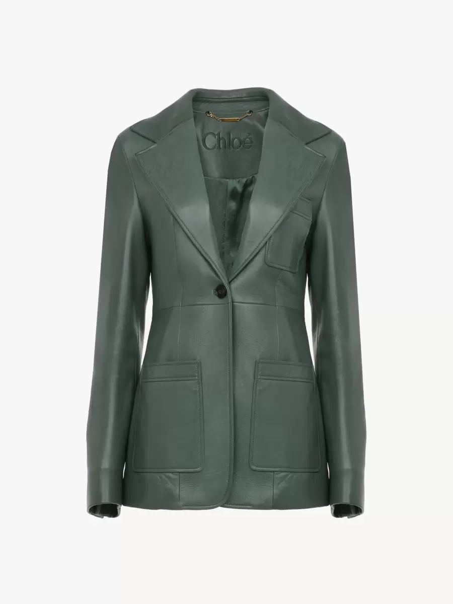Yumuşak kuzu derisinden, oyma boynuz düğmeler ve yama ceplere sahip, tek düğmeli, özel dikim ceket.