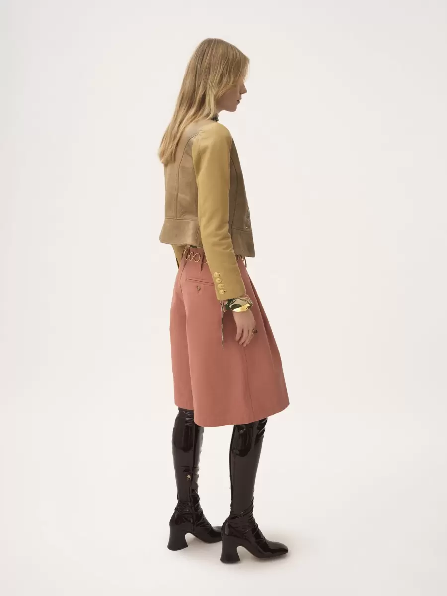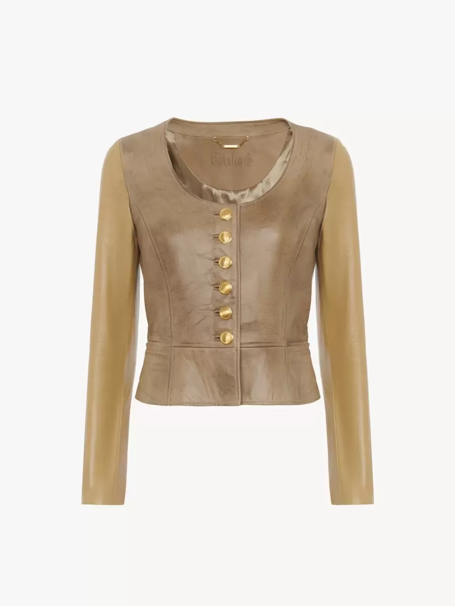Yumuşak kuzu derisinden, büzgülü silüete sahip, altın tonlarında düğmelere sahip yuvarlak yakalı ceket.