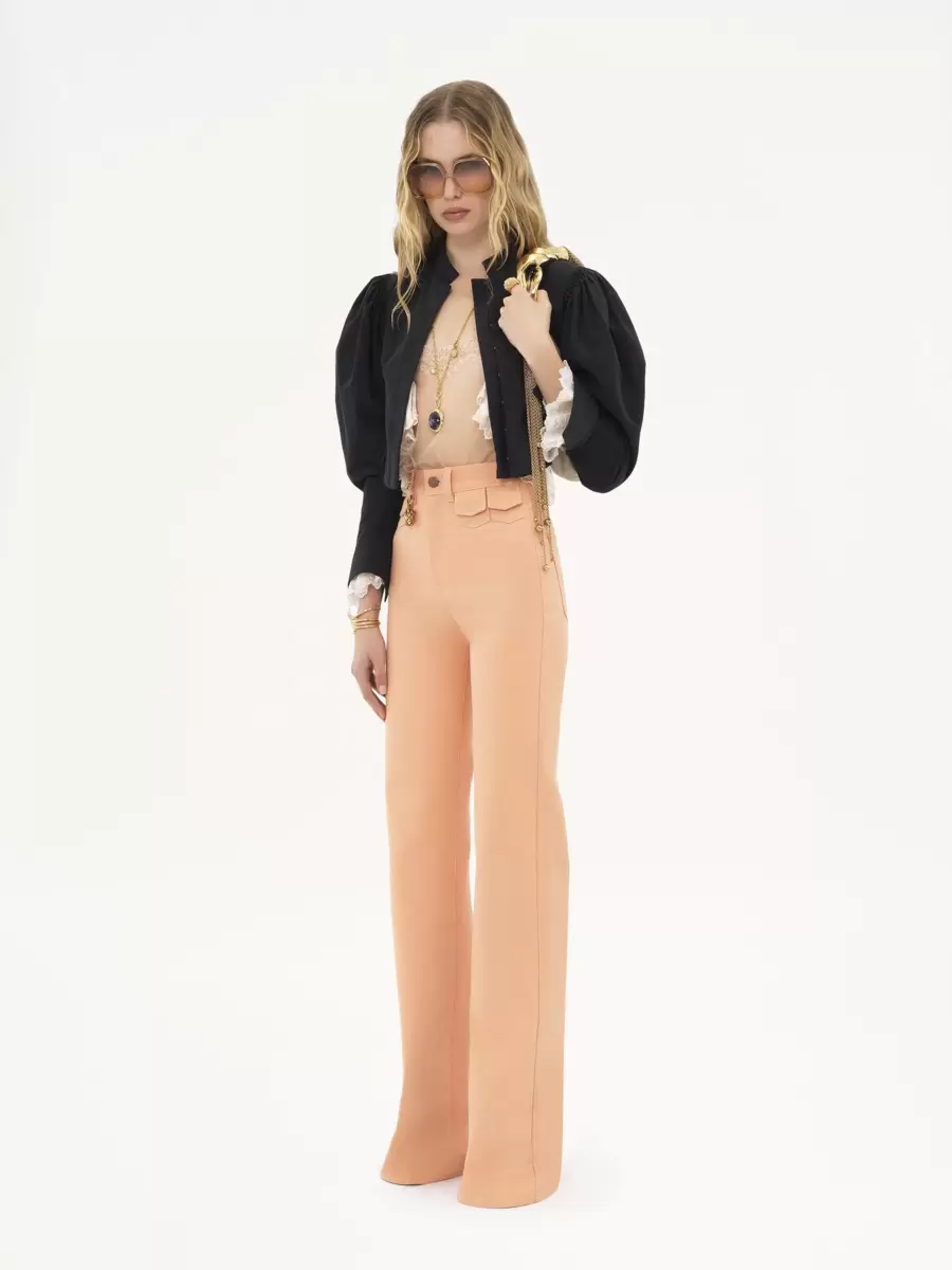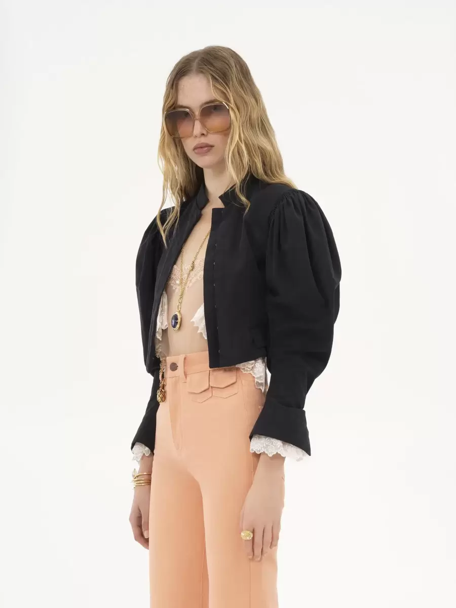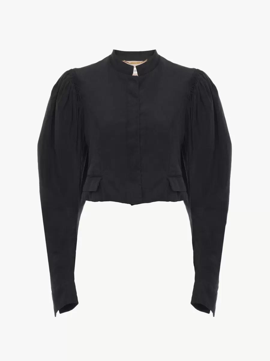 Hafif ipek faille kumaştan, manşetleri büzgülü, kabarık kollu kısa ceket. Mini kapaklı cepler, kopçalar ve kumaş kaplı düğmeler bu parçayı tamamlıyor.