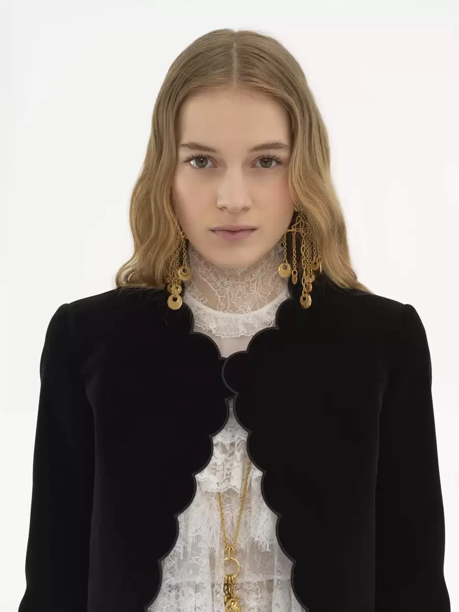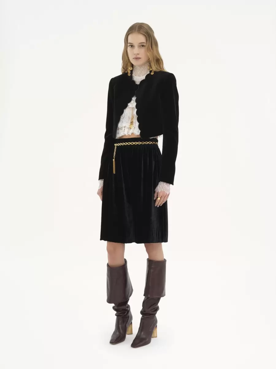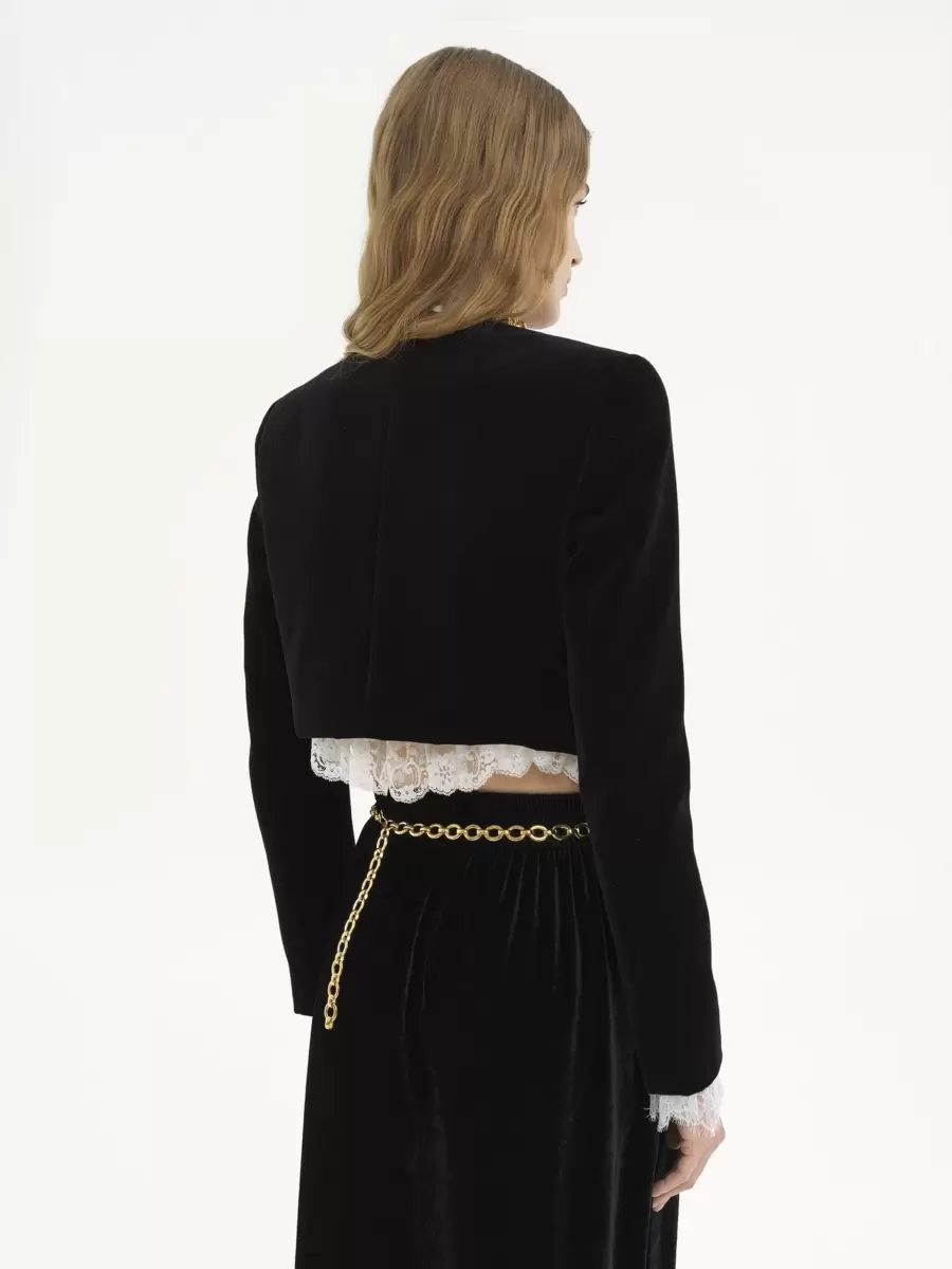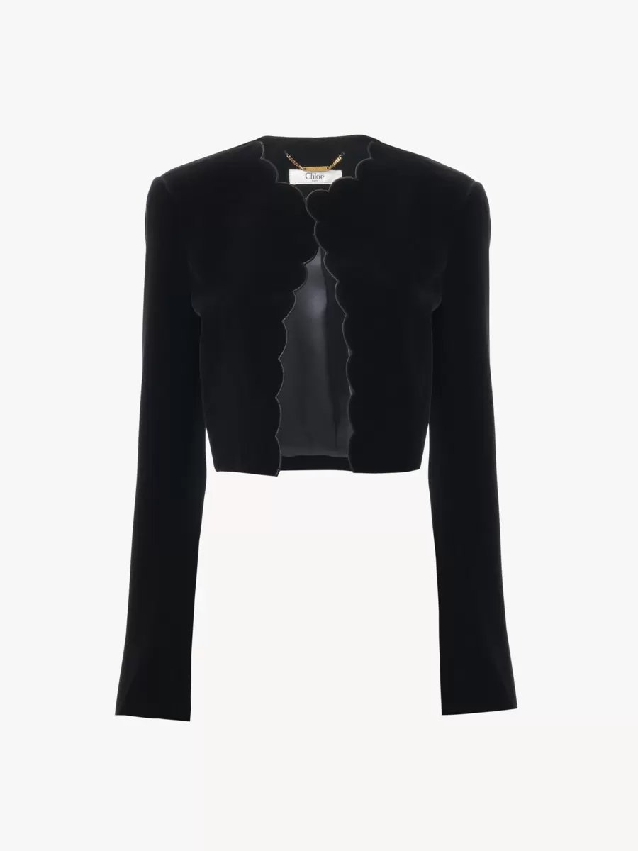 Yumuşak, mat pamuklu kadifeden yapılmış taraklı Spencer ceket, yaka ve ön kısmında imza detayı için taraklı işlemeler bulunur.