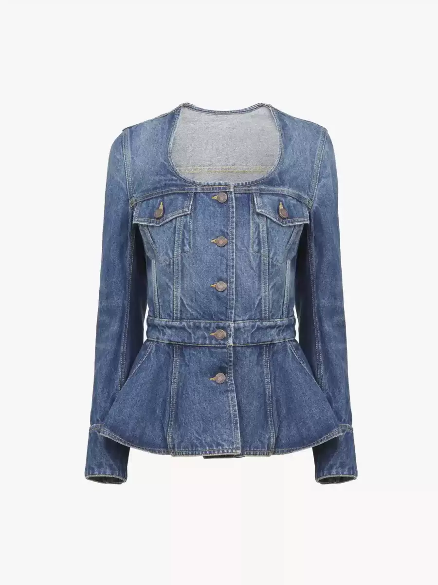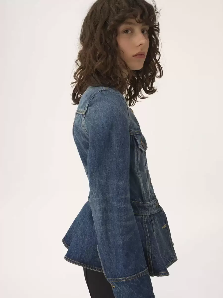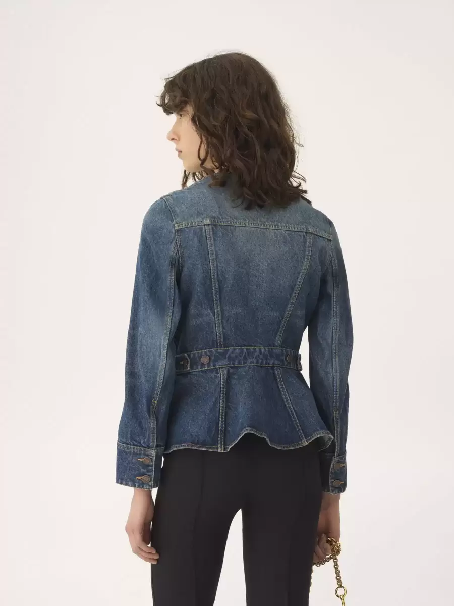 Chloé işlemeli düğmelere ve kapaklı göğüs ceplerine sahip, indigo yıkama organik pamuklu denimden yuvarlak yakalı peplum binici ceketi.