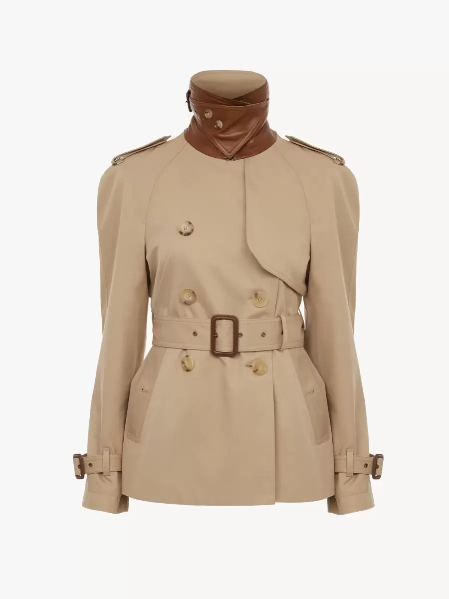 Pamuklu gabardinden kısa trençkot, kuzu derisi kaplamalı çene askılı yaka, oyma boynuz düğmeler ve çıkarılabilir tokalı kemerden oluşmaktadır. Fırtına kapağı, omuz askıları ve manşet askıları bu parçayı tamamlıyor.