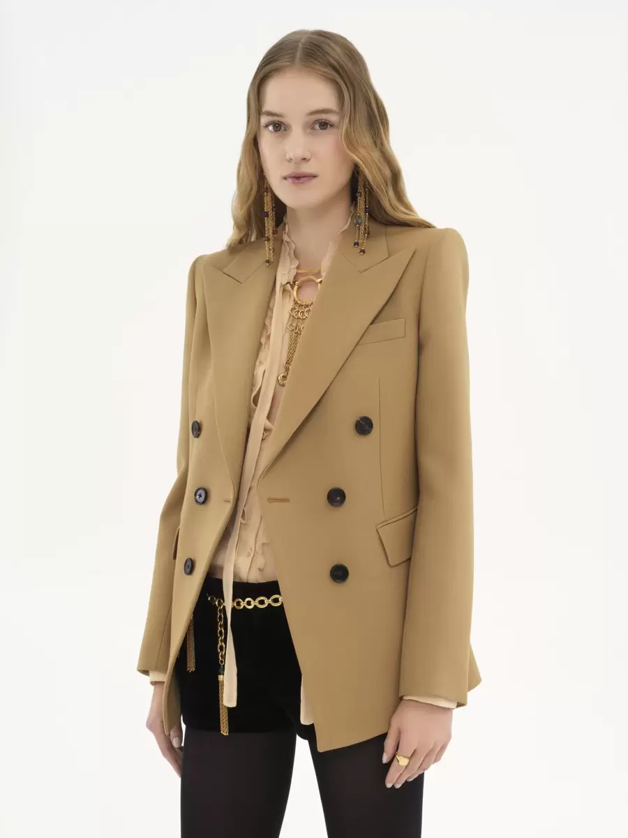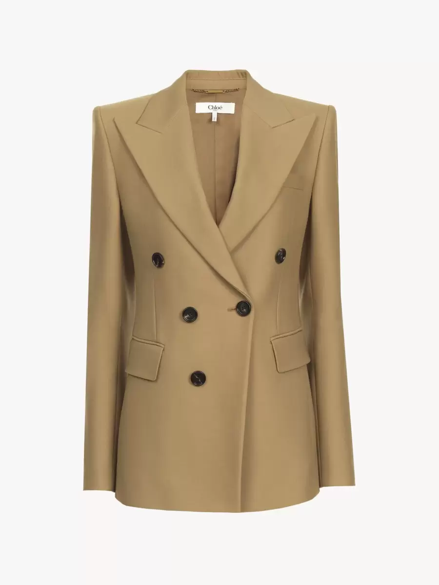 Düşük etkili yün taneli toz kumaştan, oymalı boynuz düğmeler ve ön ceplerle detaylı, çift düğmeli, özel dikim ceket.