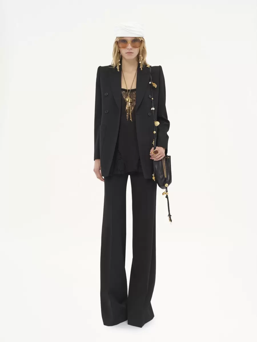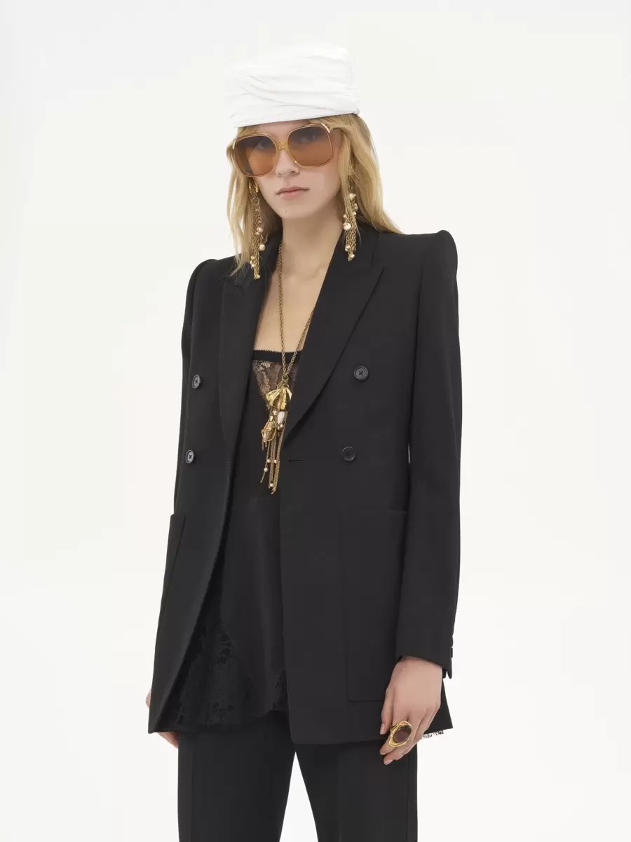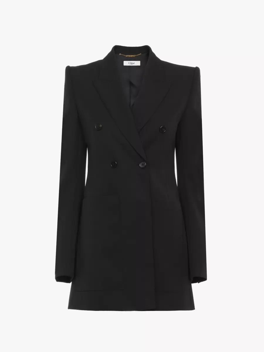 Düşük etkili yün taneli toz kumaştan, oyma boynuz düğmeler ve büyük yama ceplere sahip, çift düğmeli, özel dikim ceket.