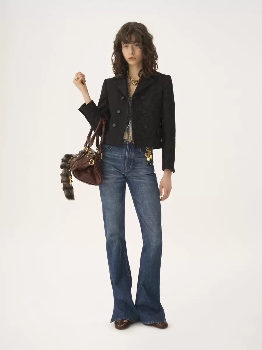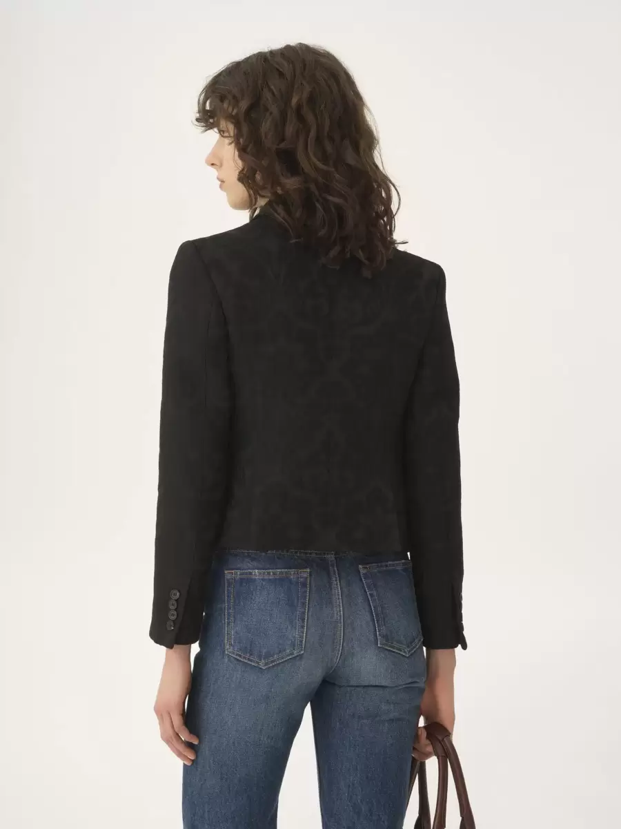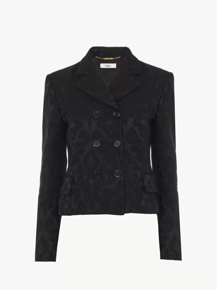 Süslü yün karışımlı jakarlı, çift düğmeli, dar kesim ceket, oymalı boynuz düğmeler ve kapaklı cepler.