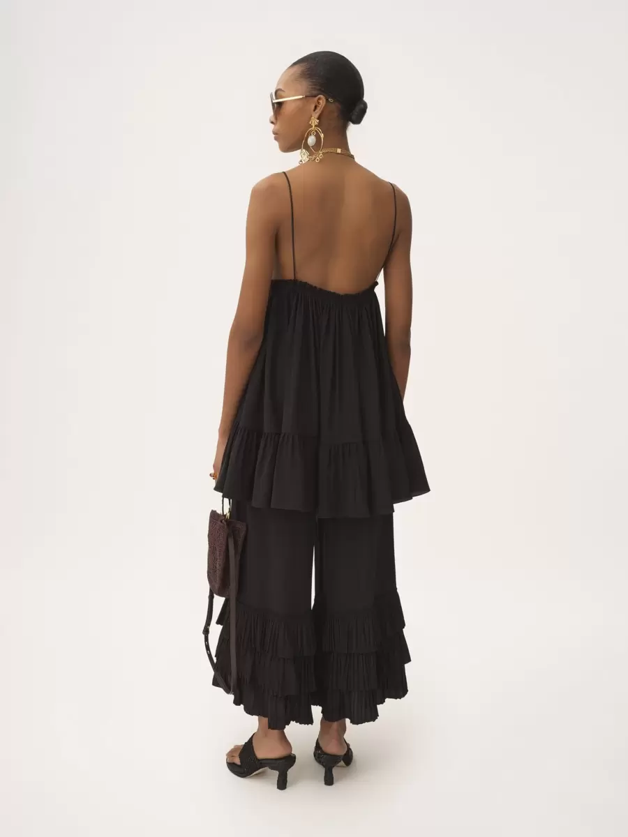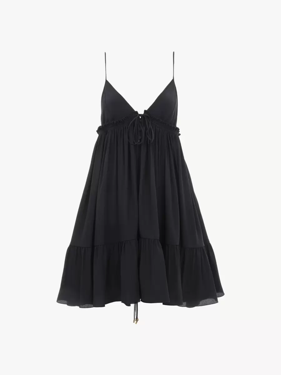 İpek karışımlı astarlı, organik ipek krep de şin kumaştan, akışkan büzgülü mini elbise. İnce askılar, kumaş kaplı düğmeler ve altın tonlarında metal uçlarla tamamlanmış bağcıklı bağcıklar içeriyor.