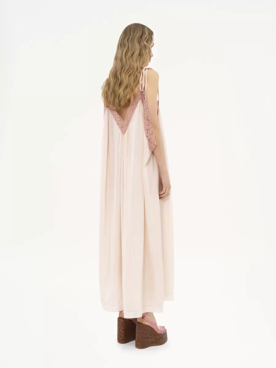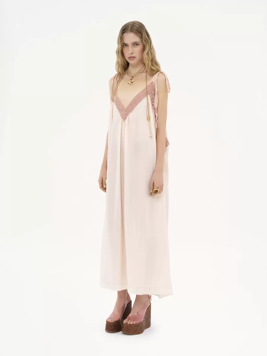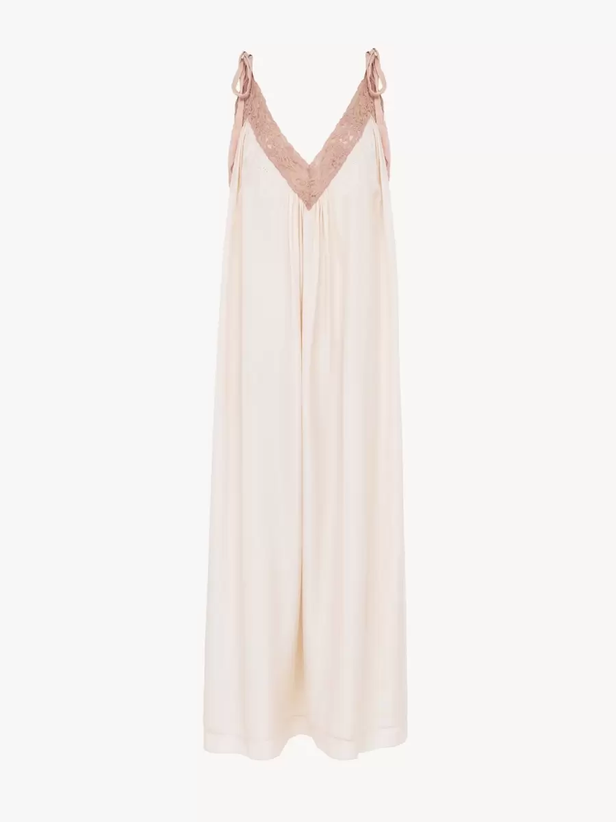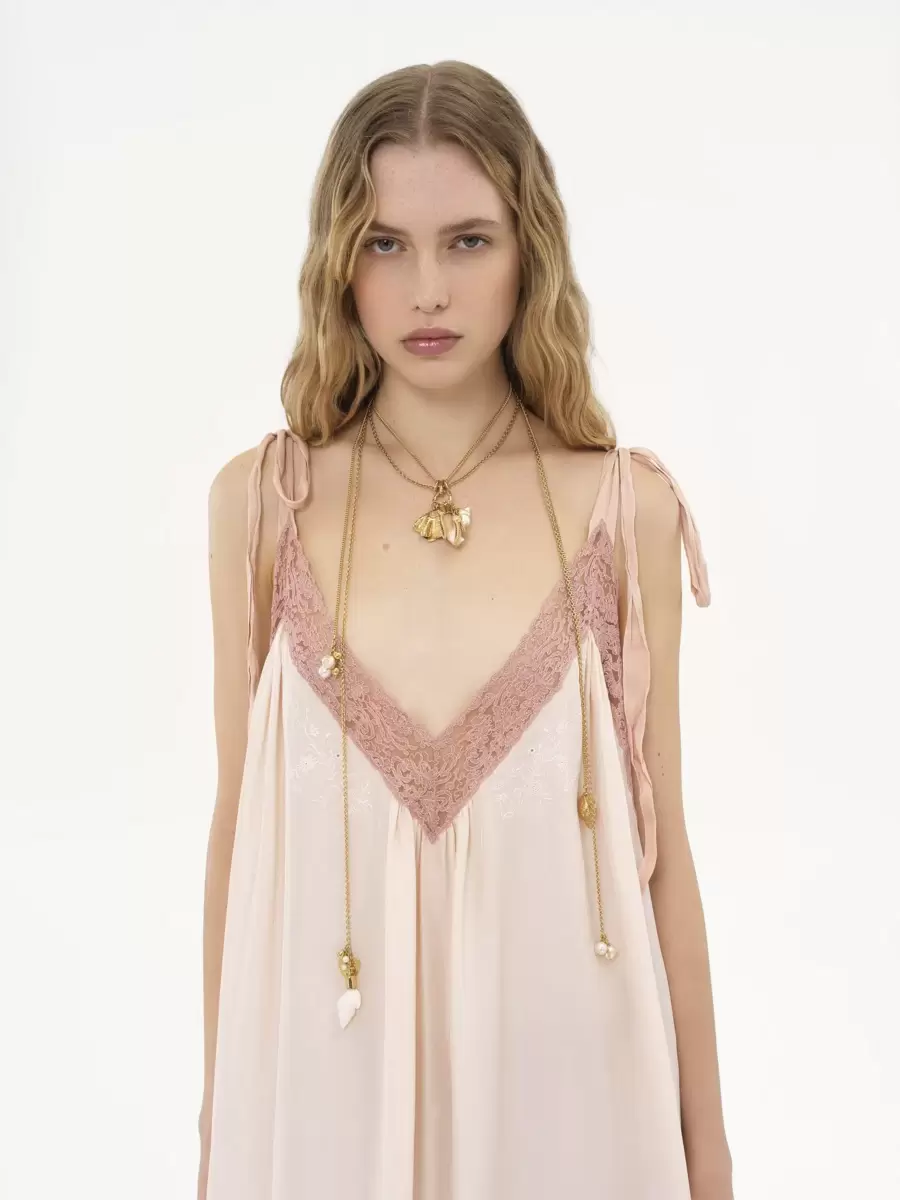 Yumuşak ipek habotai kumaştan, V yakası boyunca dantel süslemeli ve omuzlarda bağlanan ince askılı, akışkan uzun gece elbisesi. Ayrı bir elbise astarı bu parçayı tamamlıyor.