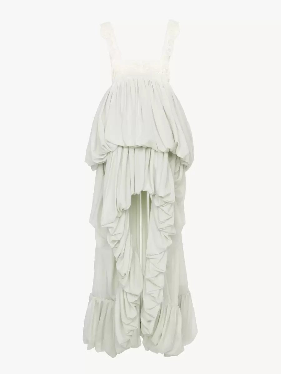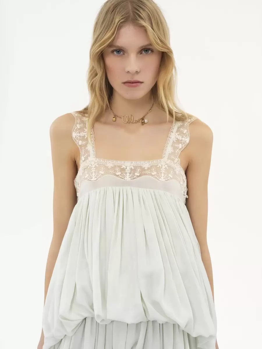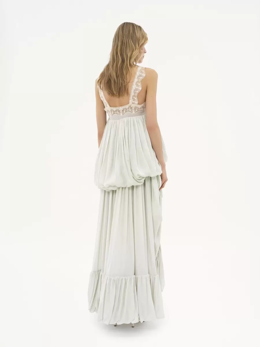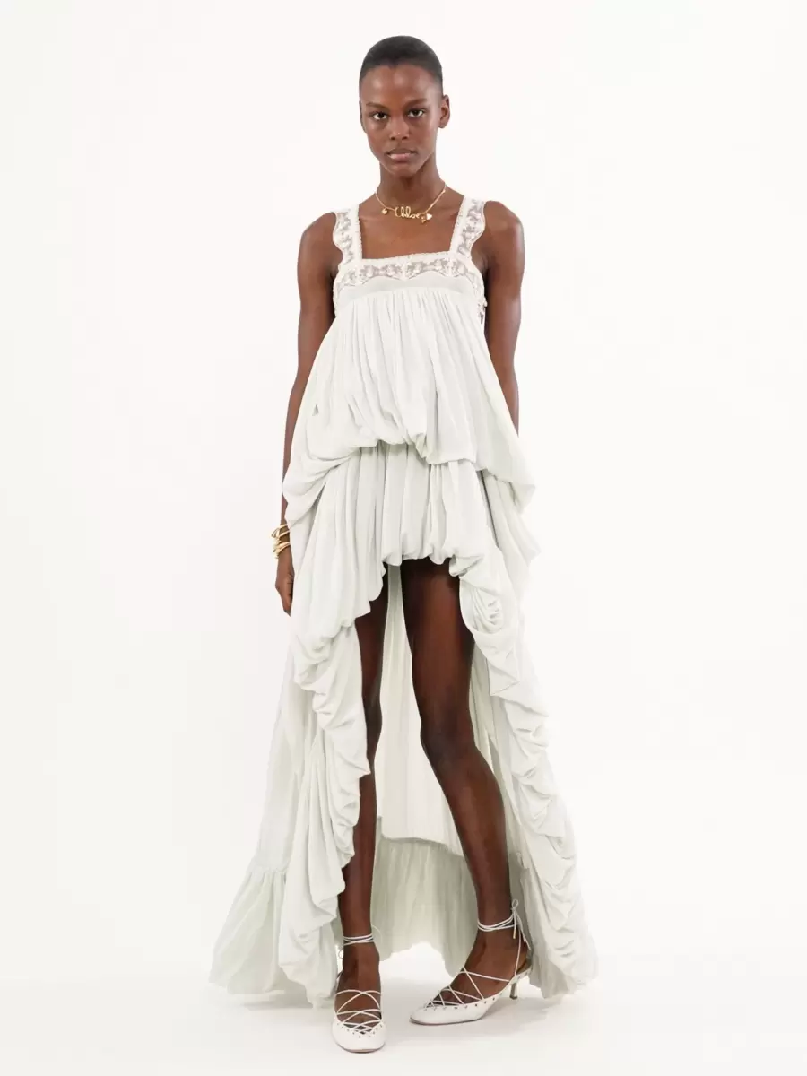 Hafif organik ipek habotai kumaştan yapılmış, toplanmış ve dalgalı bir silüete sahip, kare yakalı, dantel süslemeli ve sedef düğmeli, kolsuz, yüksek-alçak fırfırlı elbise.