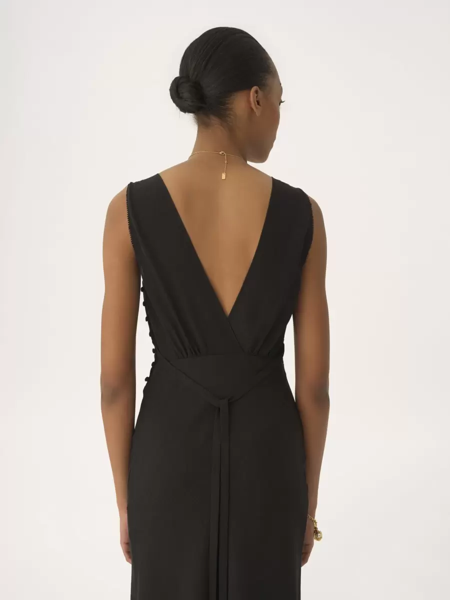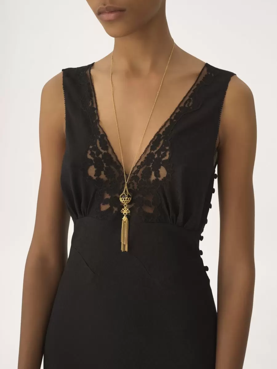 Dantel ekleri olan mini çiçekli jakarlı organik ipekten V yakalı kolsuz sütun elbise, kumaş kaplı düğmeler ve kurdele ile donatılmıştır.
