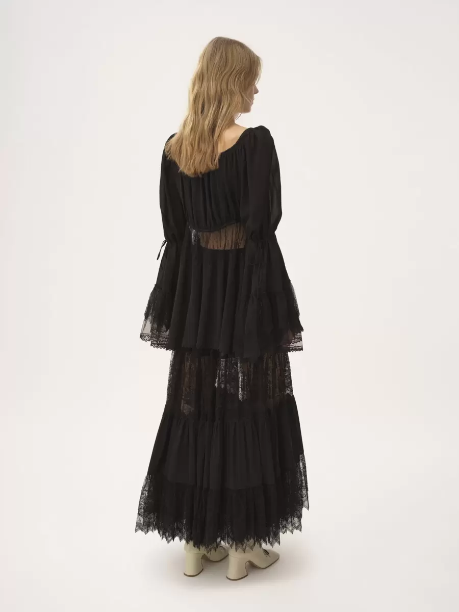 Organik ipek jorjet kumaştan, ipek karışımı astarlı, katlı, uzun etek. Ortada ve etek ucunda dantel detaylar yer alıyor. Kumaş kaplı düğmeler sol tarafta detaylandırılmıştır.