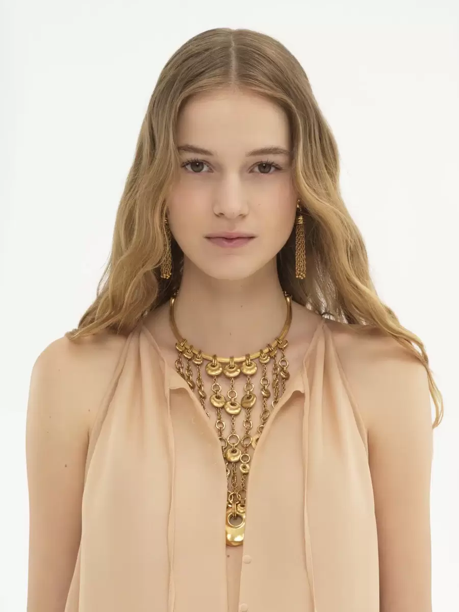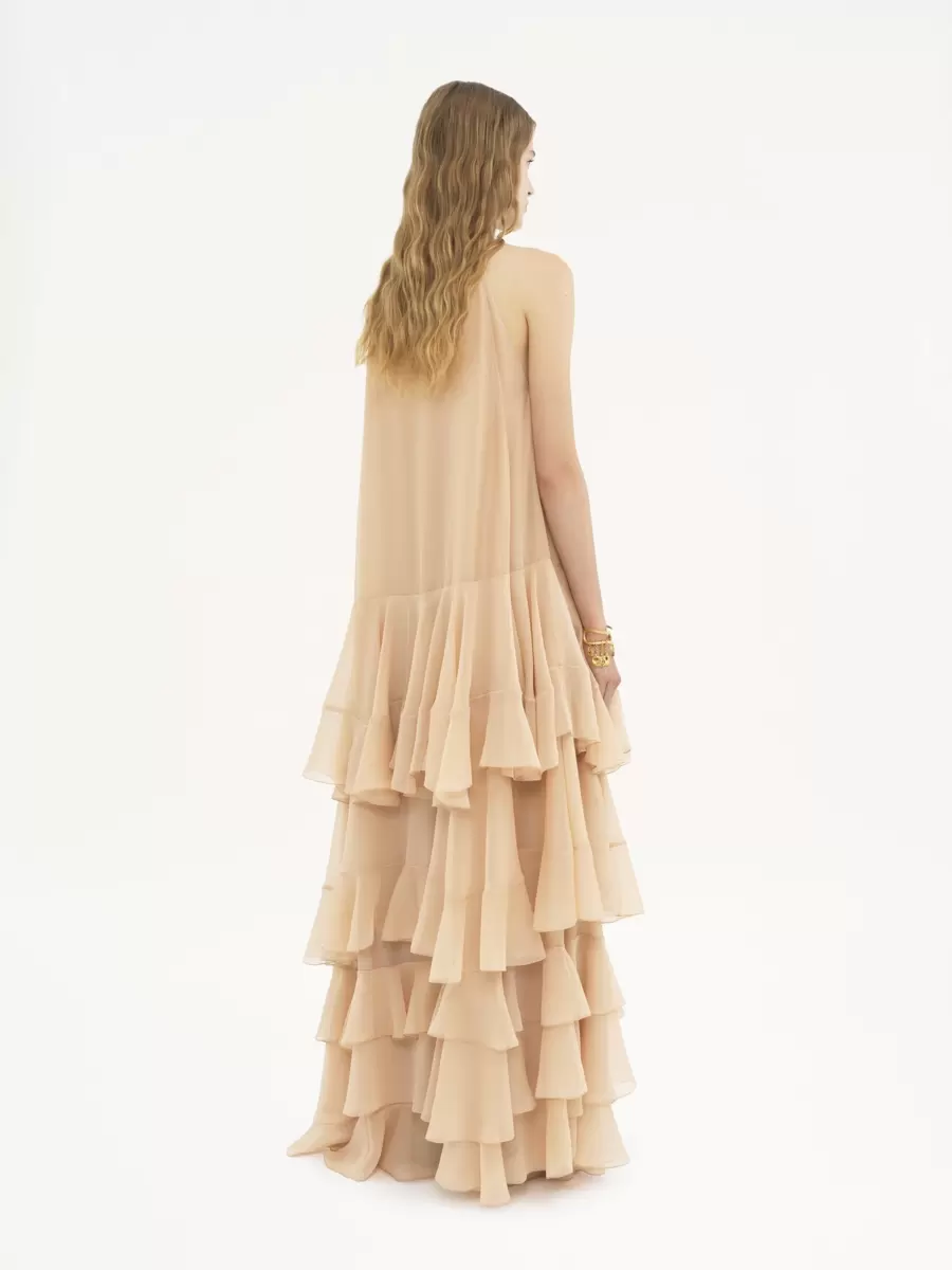 Yarı şeffaf organik ipek jorjet kumaştan, ipek karışımı astarlı, derin V yakalı, kademeli fırfırlı ve altın tonlarında uçlarla tamamlanmış sallantılı bağcıklı, kolsuz, katlı maksi elbise.