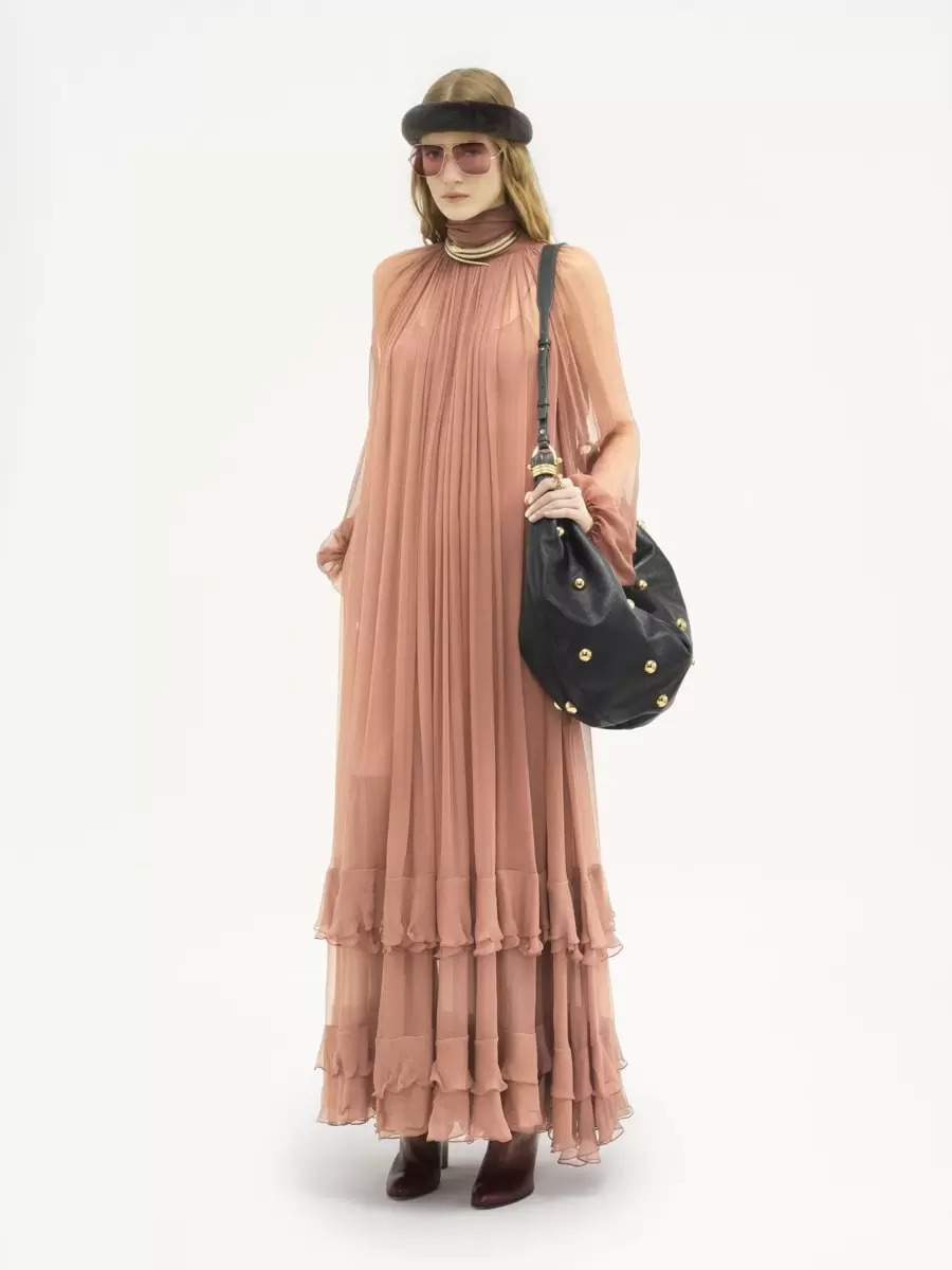 Lavallière bağcıklı, gizli düğmeler ve katlı, fırfırlı etek ucuna sahip, organik ipek muselinden yapılmış, büyük boy, büzgülü uzun elbise.