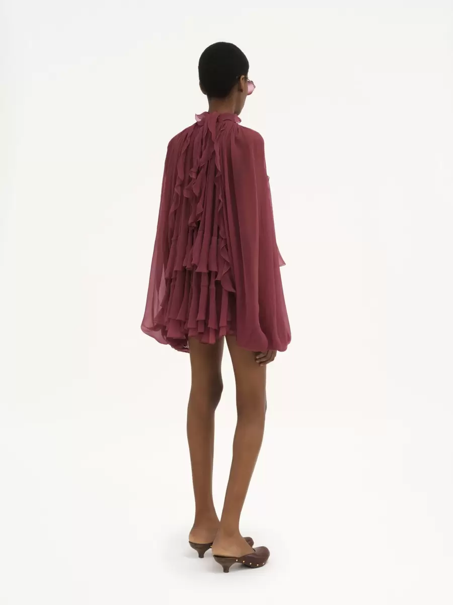 Organik ipek muselinden yapılmış, lavallière bağcıklı, büzgülü silüetli ve fırfırlı mini pelerin elbise.