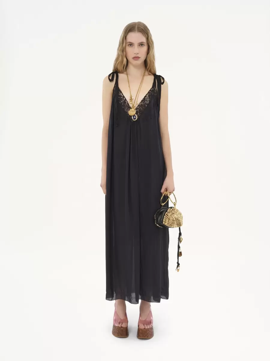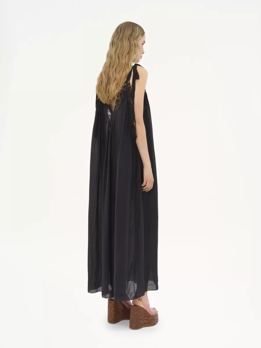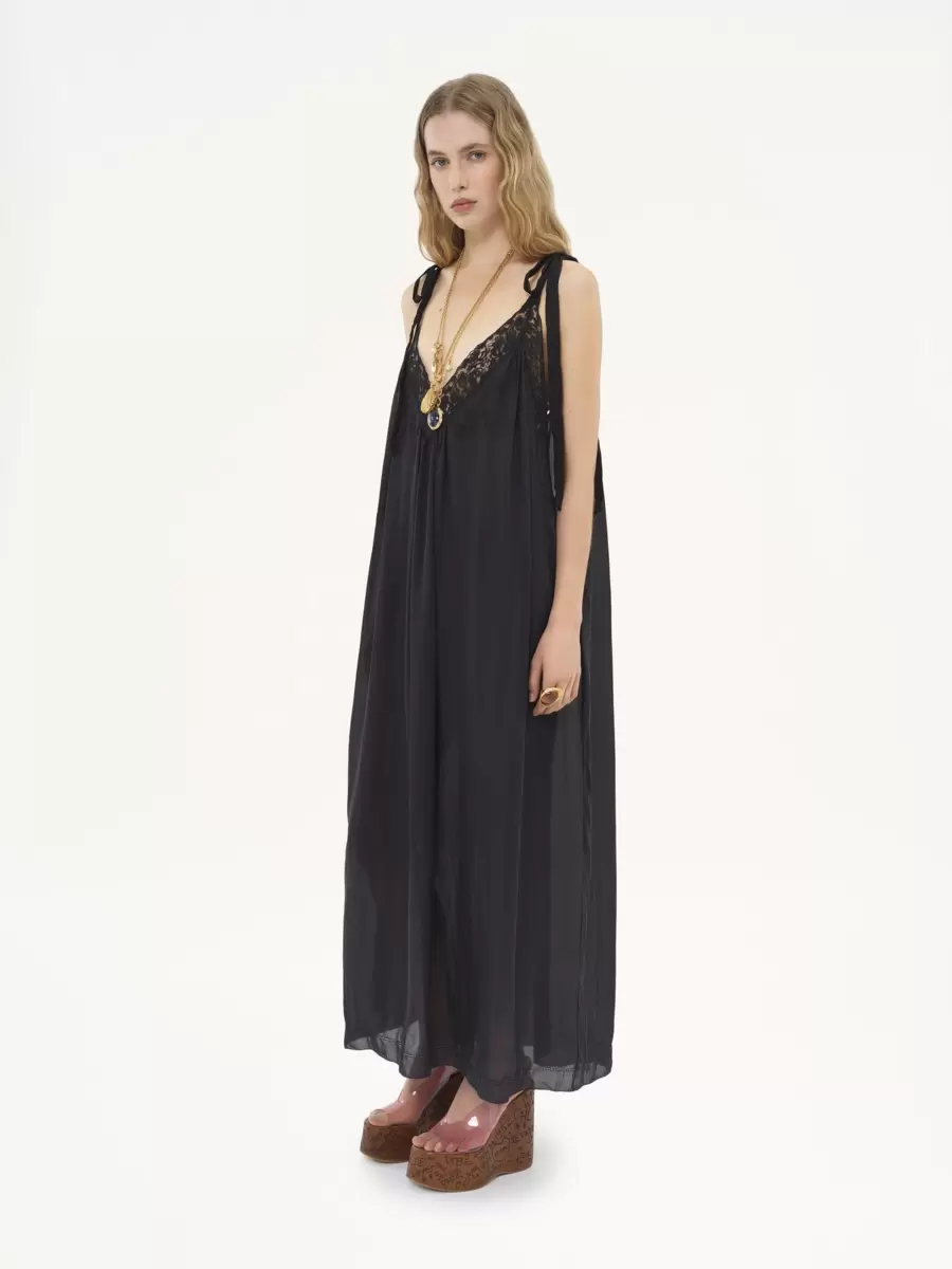 Hafif organik ipek şarmözden yapılmış, V yakası dantel detaylı ve omuzlarda bağlanan ince askılı, akışkan uzun gece elbisesi. Ayrı bir elbise astarı bu parçayı tamamlar.