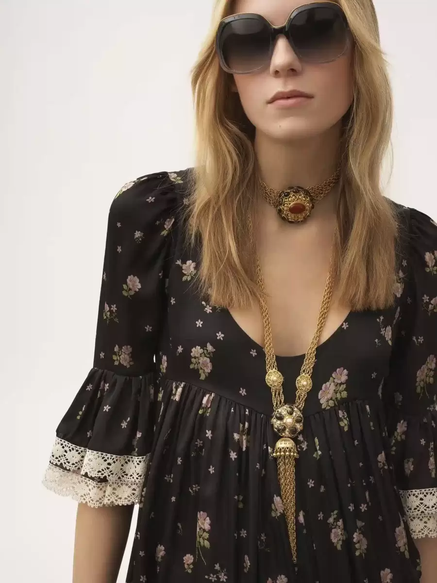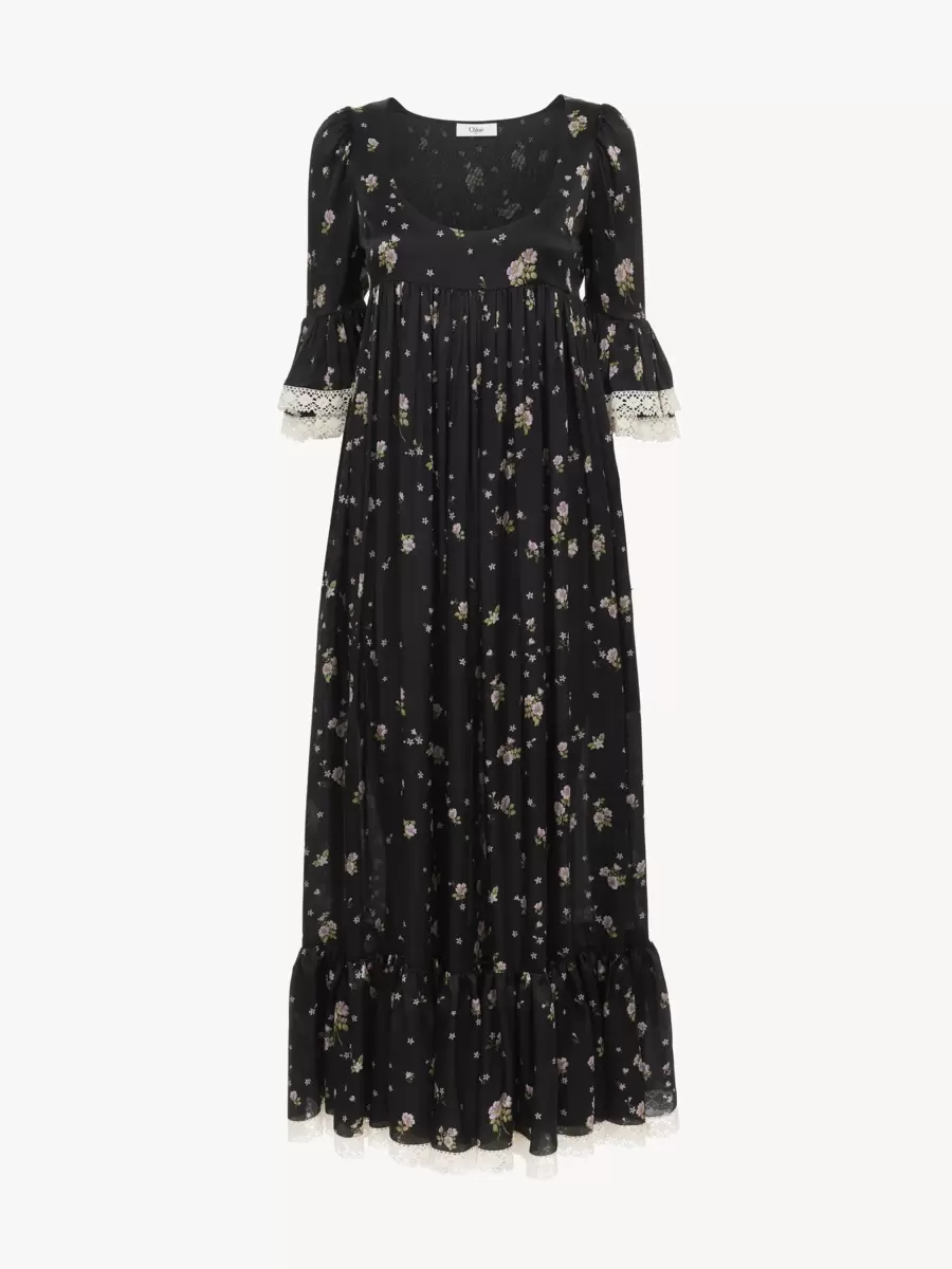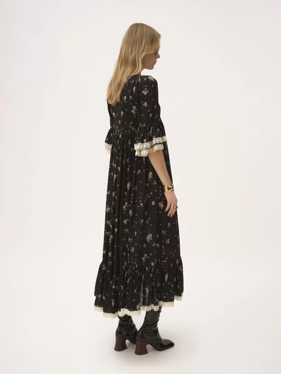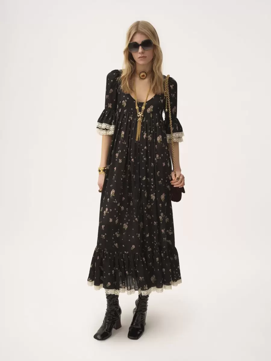 Liberty desenli ve dantel süslemeli, ipek şarmözden yapılmış, yuvarlak yakalı midi elbise. Toplanmış silüet, ipek karışımı astar içerirken, fırfırlı süslemeler etek ucunu ve dirsek uzunluğundaki kolları detaylandırır.
