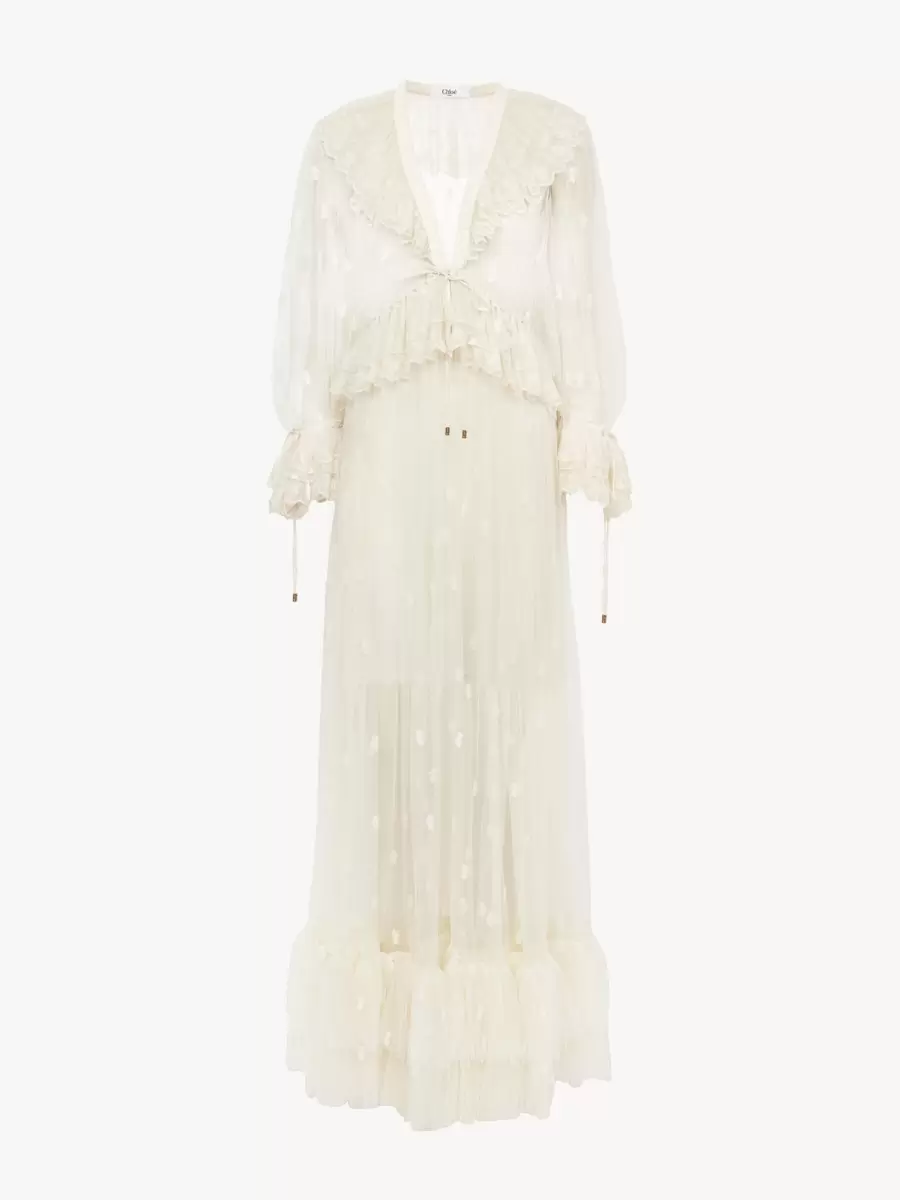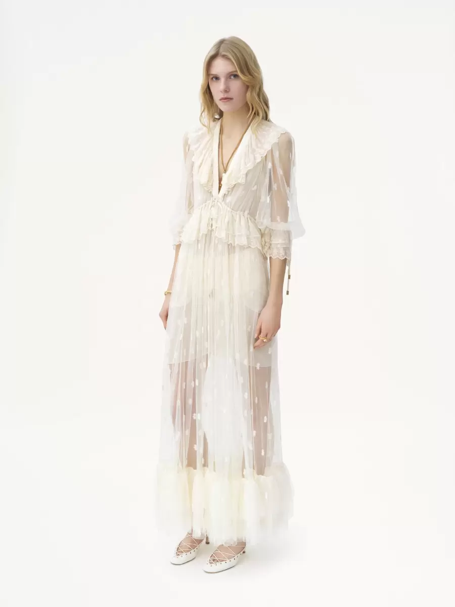 Maison’un mirasından esinlenerek işlenmiş dantelden yapılmış, ayrı bir elbise astarına sahip, büzgülü V yakalı uzun elbise. Volanlı elbise, belinde ve manşetlerinde bağcıklı bağcıklara ve altın tonlu uçlara sahiptir.