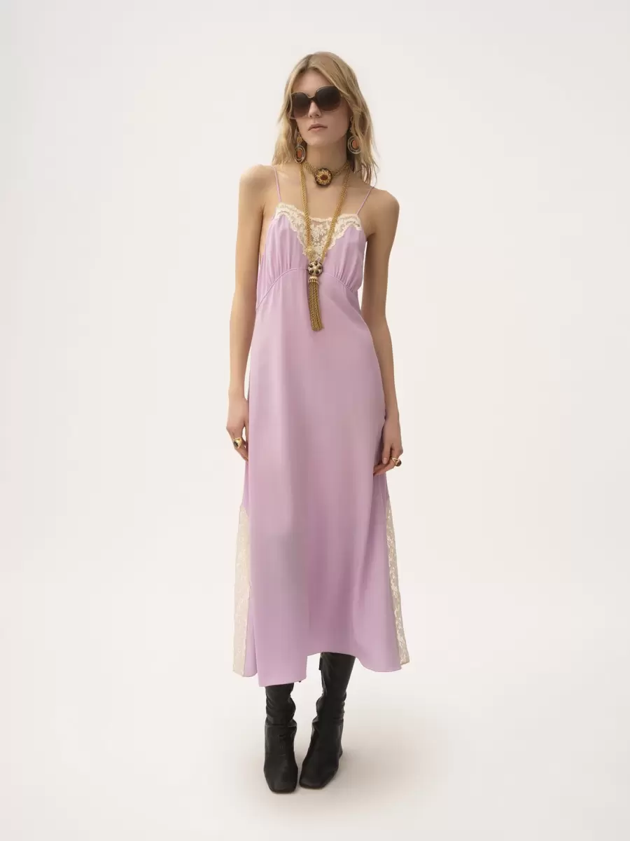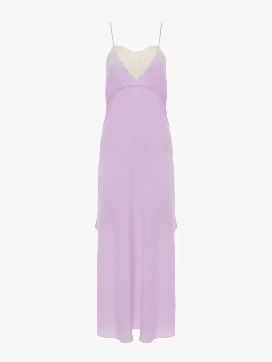 İnce askılı midi elbise, kontrast dantel ekleri ve büzgülü detaylarla organik ipek krep de şin kumaştan yapılmıştır.