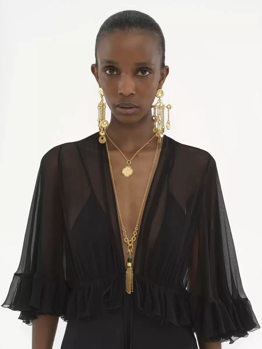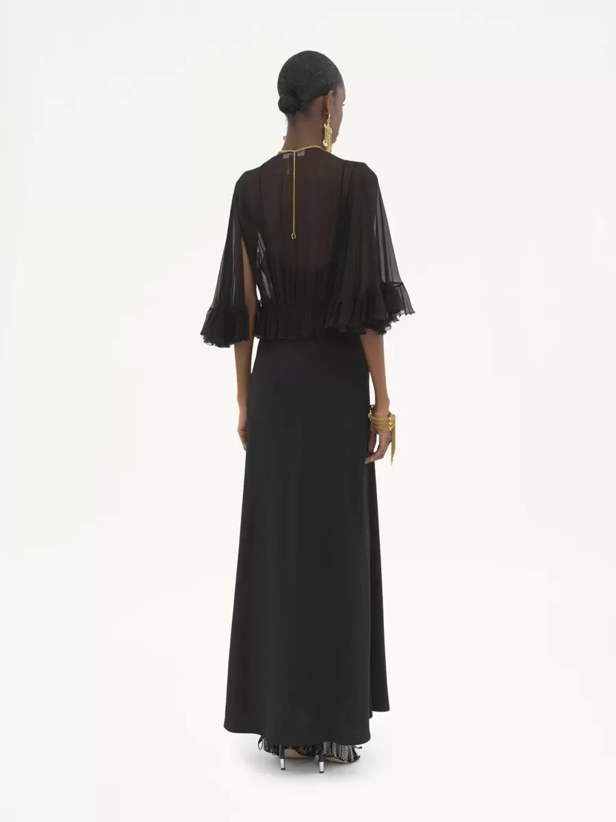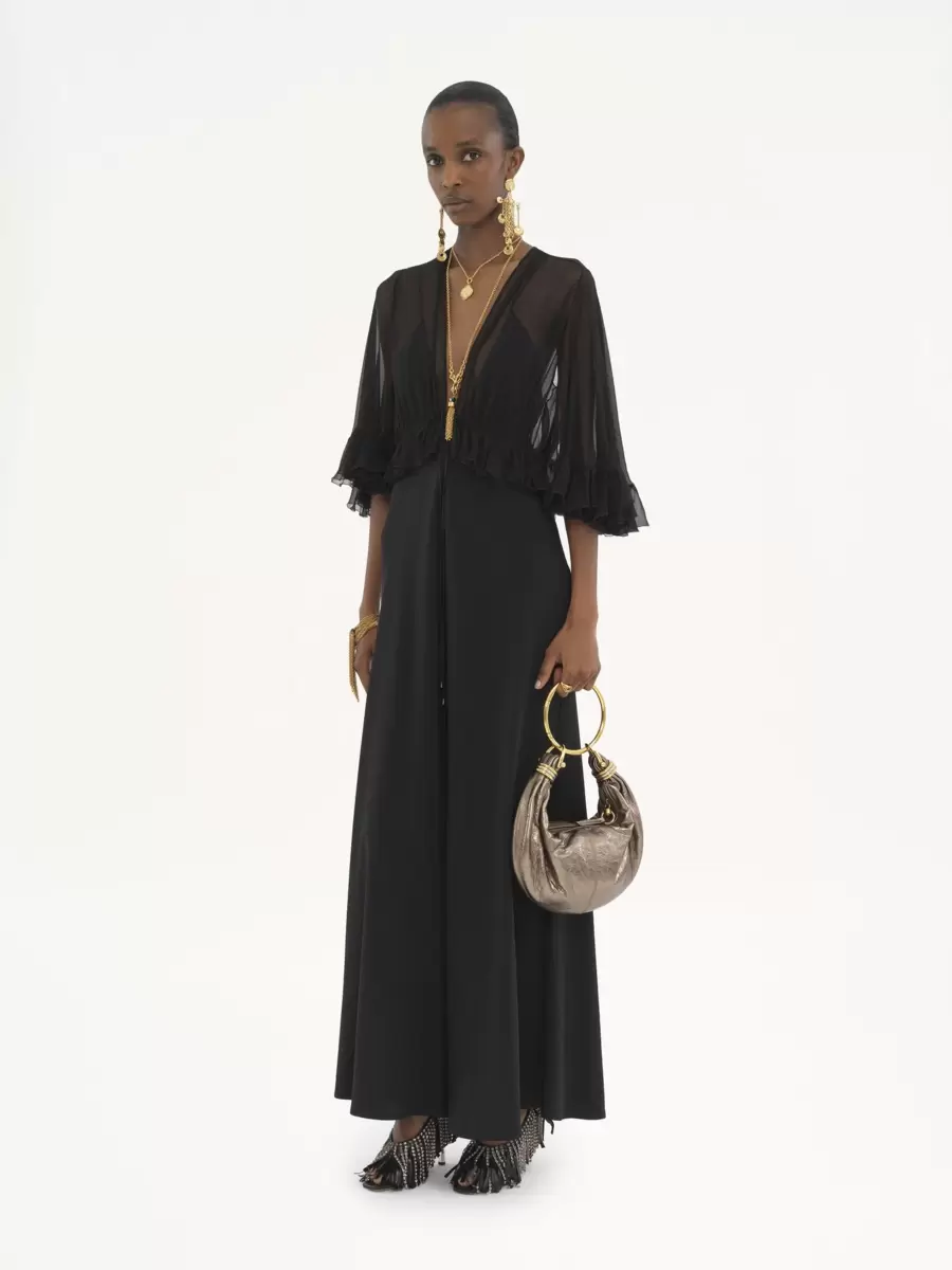 İpek karışımlı astarlı, yıkanmış krep satenden, akışkan V yakalı uzun elbise. Toparlayıcı detaylar, fırfırlı kenar ve altın tonlarında metal uçlarla tamamlanmış sarkan bağcıklar içeriyor.