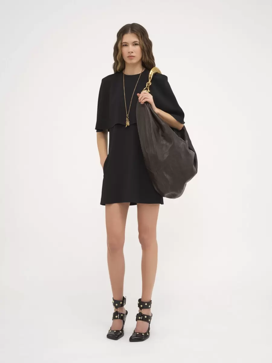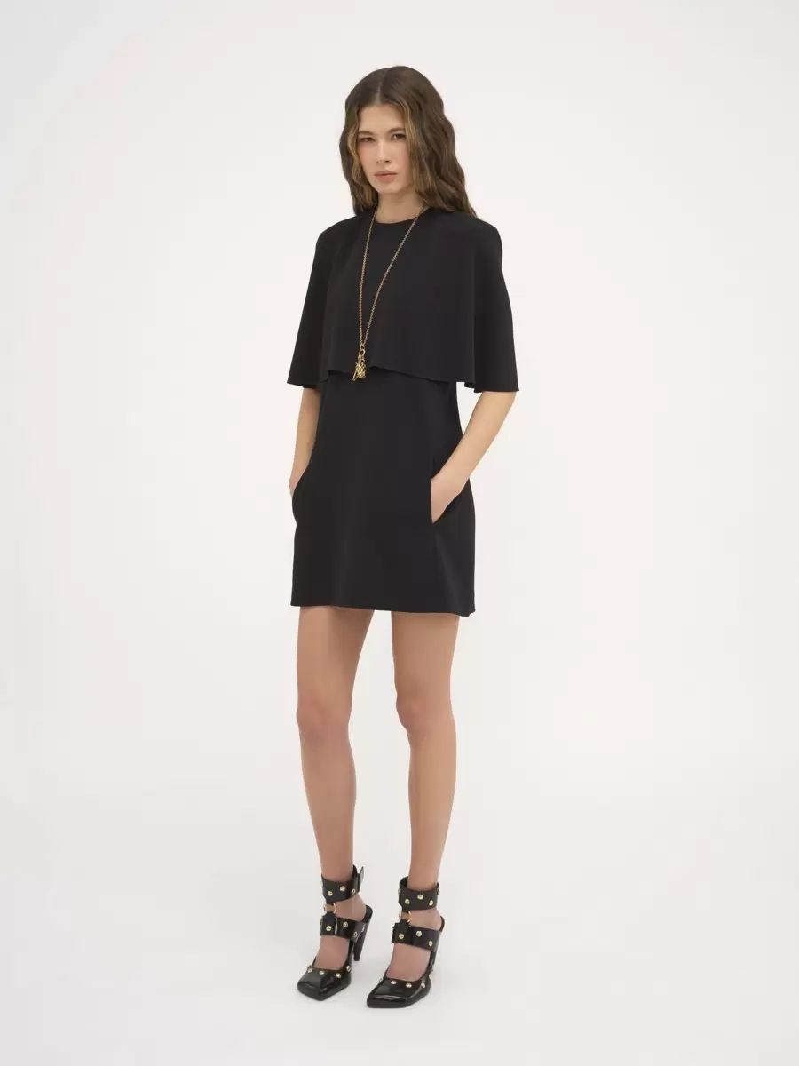 Yumuşak viskon ve krep karışımından yapılmış, yuvarlak yakalı kısa pelerin elbise.