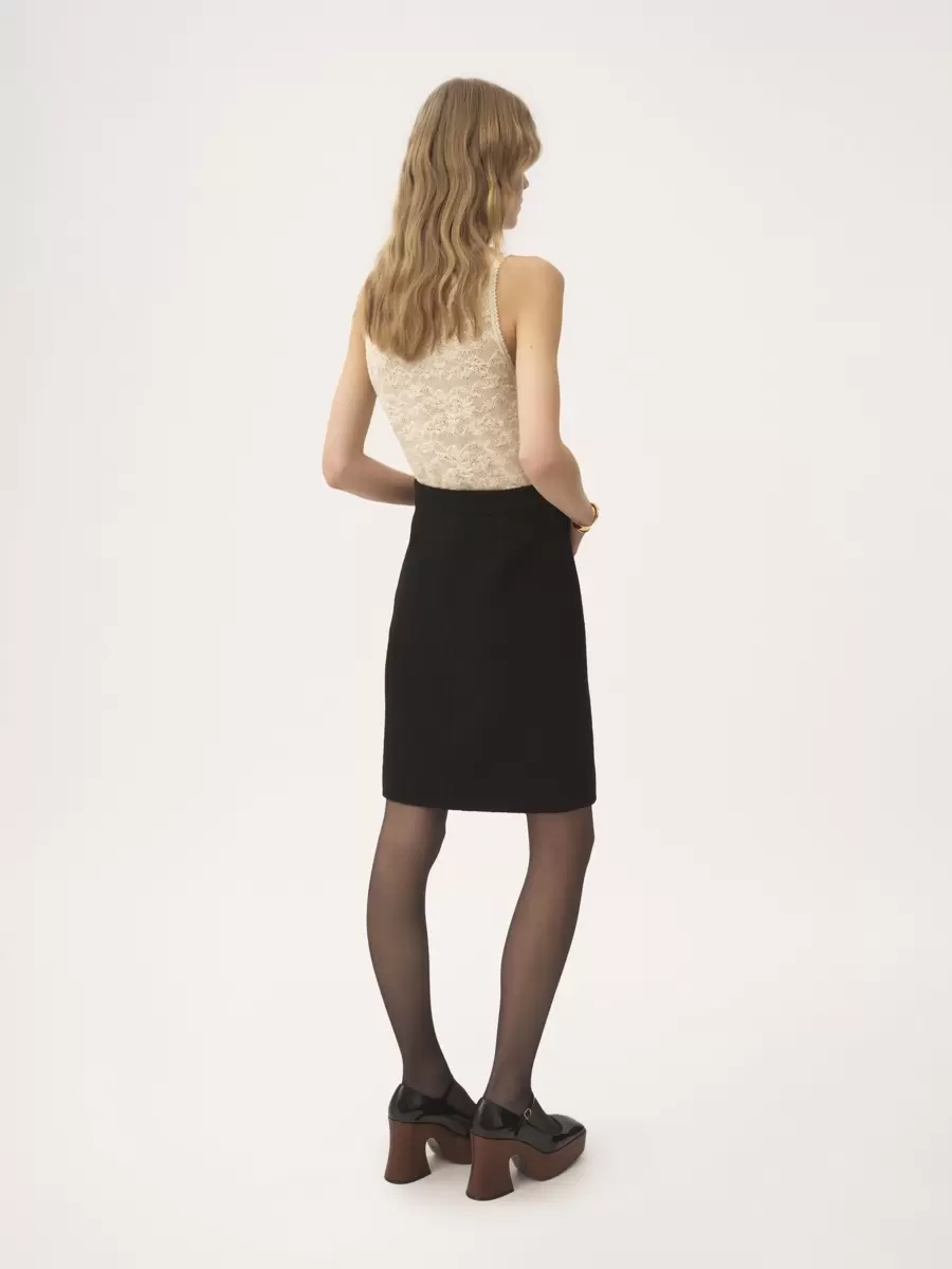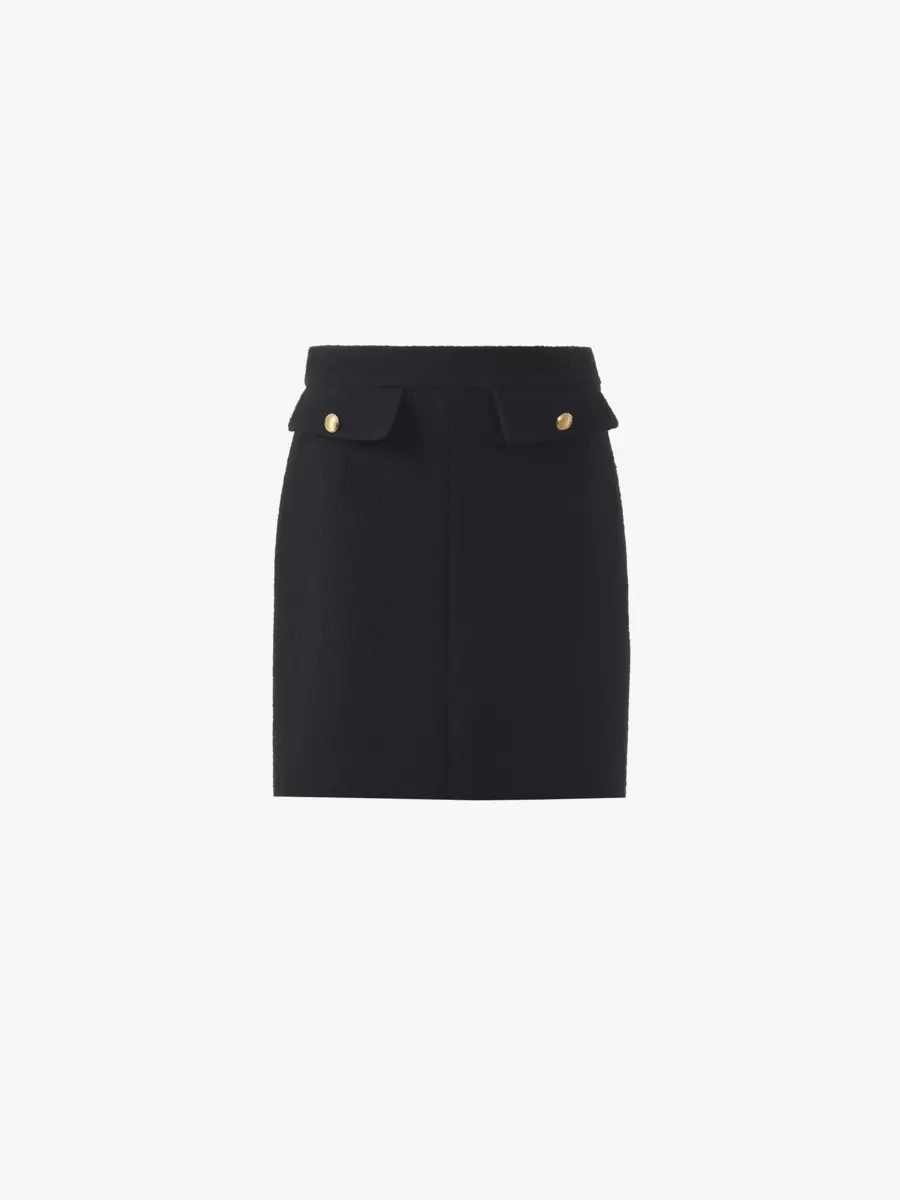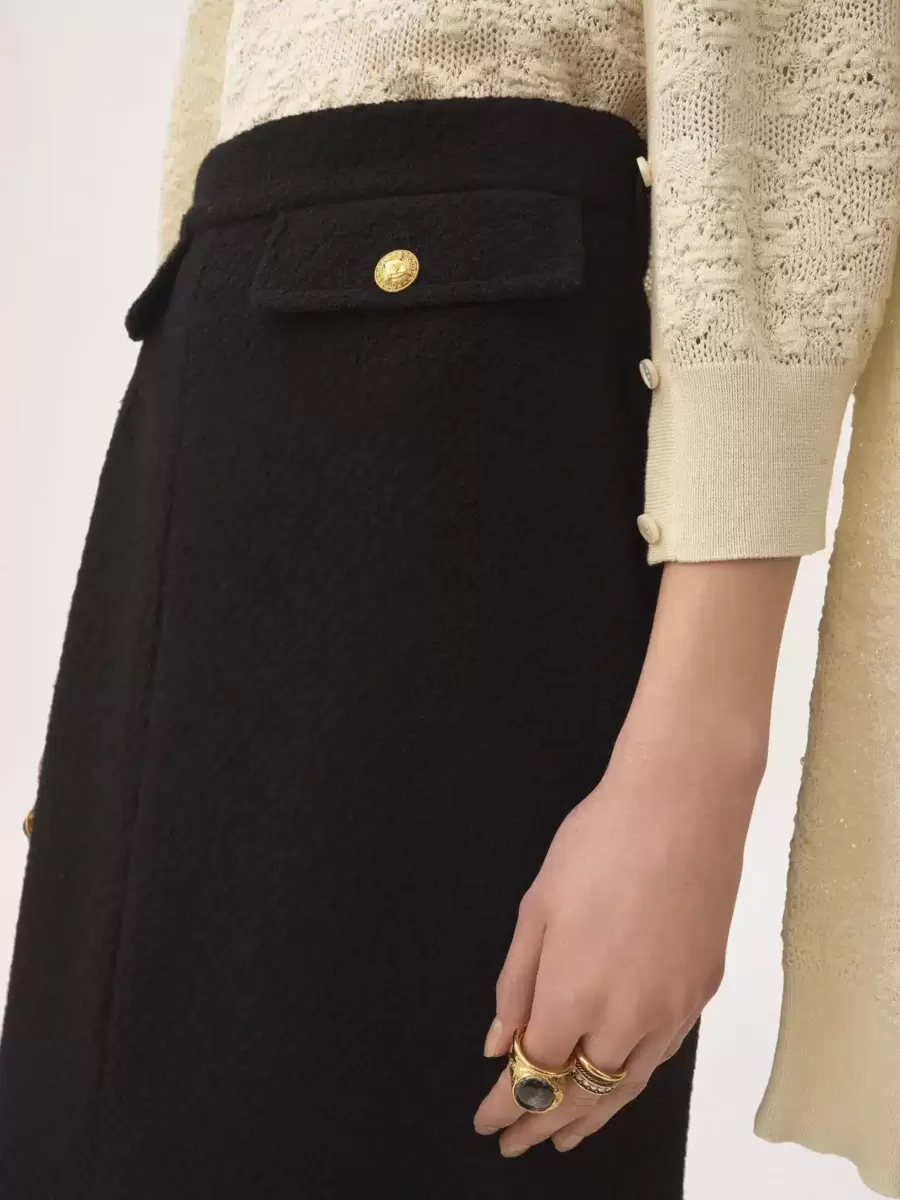 Ön kapaklı ceplere ve altın tonlarında düğmelere sahip, yün bukle kumaştan diz hizasında özel dikim etek.
