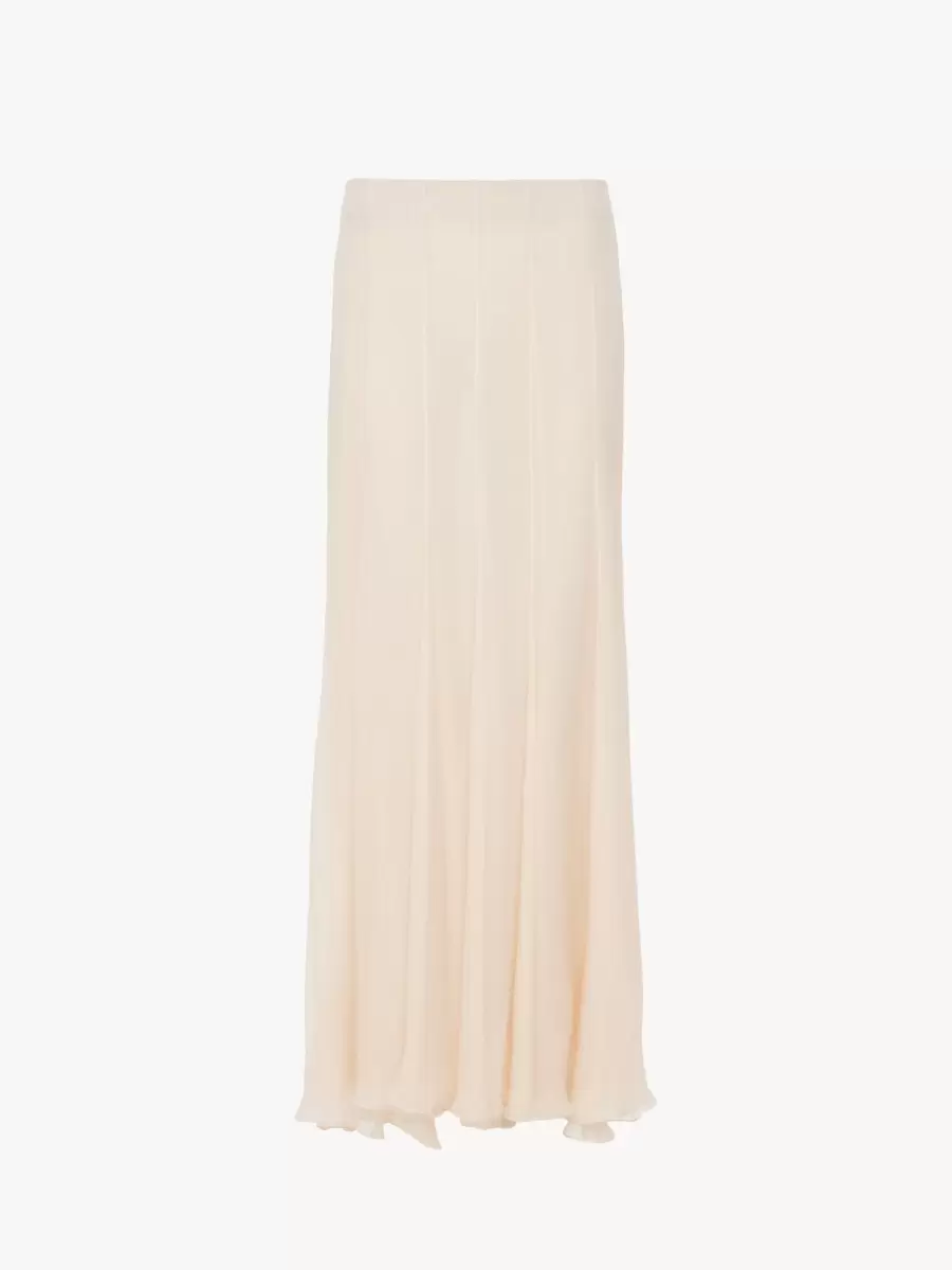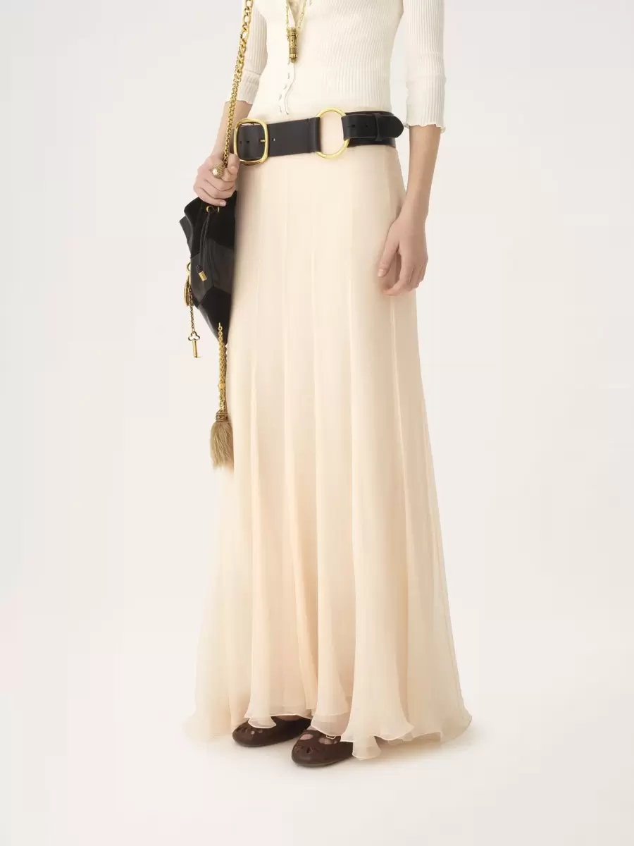 Organik ipek muselinden, ipek karışımı astarlı, fırfırlı detaylı, büzgülü akışkan maksi etek.