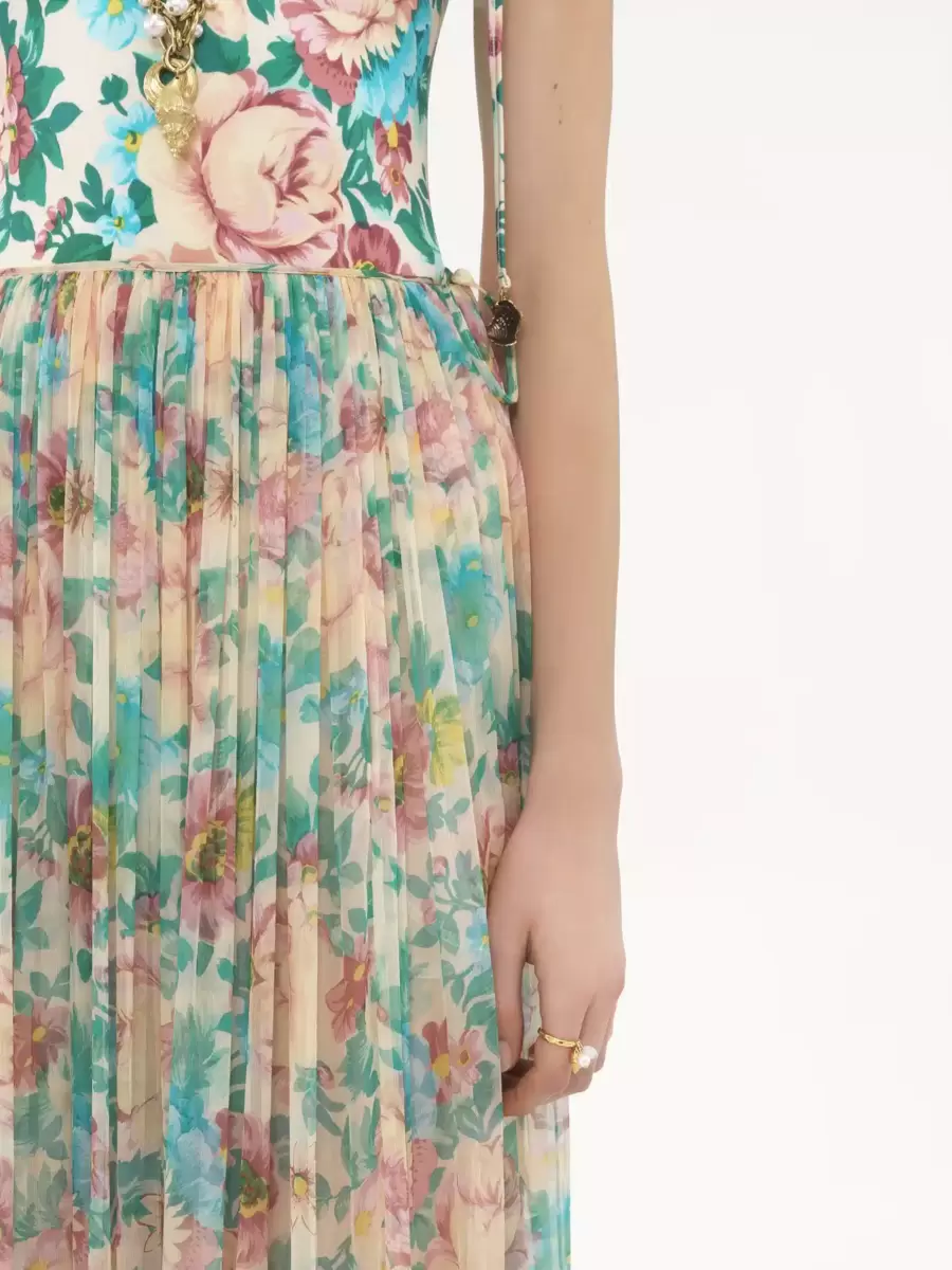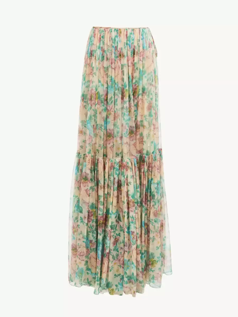 Maison’un mirasından ilham alan çiçek desenli organik ipek muslin kumaştan büzgülü maksi etek. Akışkan, katmanlı silüet, ipek karışımı bir astar içerirken, çekiçle dövülmüş metal uçlu sarkan bir yan bağ bu parçayı tamamlar.