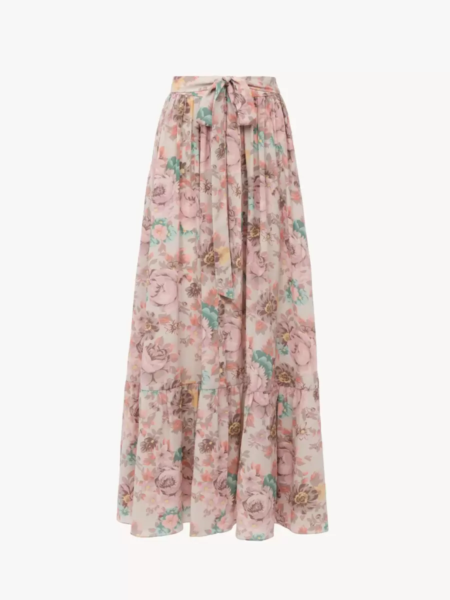 Maison’un mirasından ilham alan çiçek desenli organik ipek krep de şin kumaştan büzgülü midi etek. Akıcı, katmanlı silüet, belinde düğümlü kendi kumaşından bir kemer ve önde sedef düğmeler içeriyor.