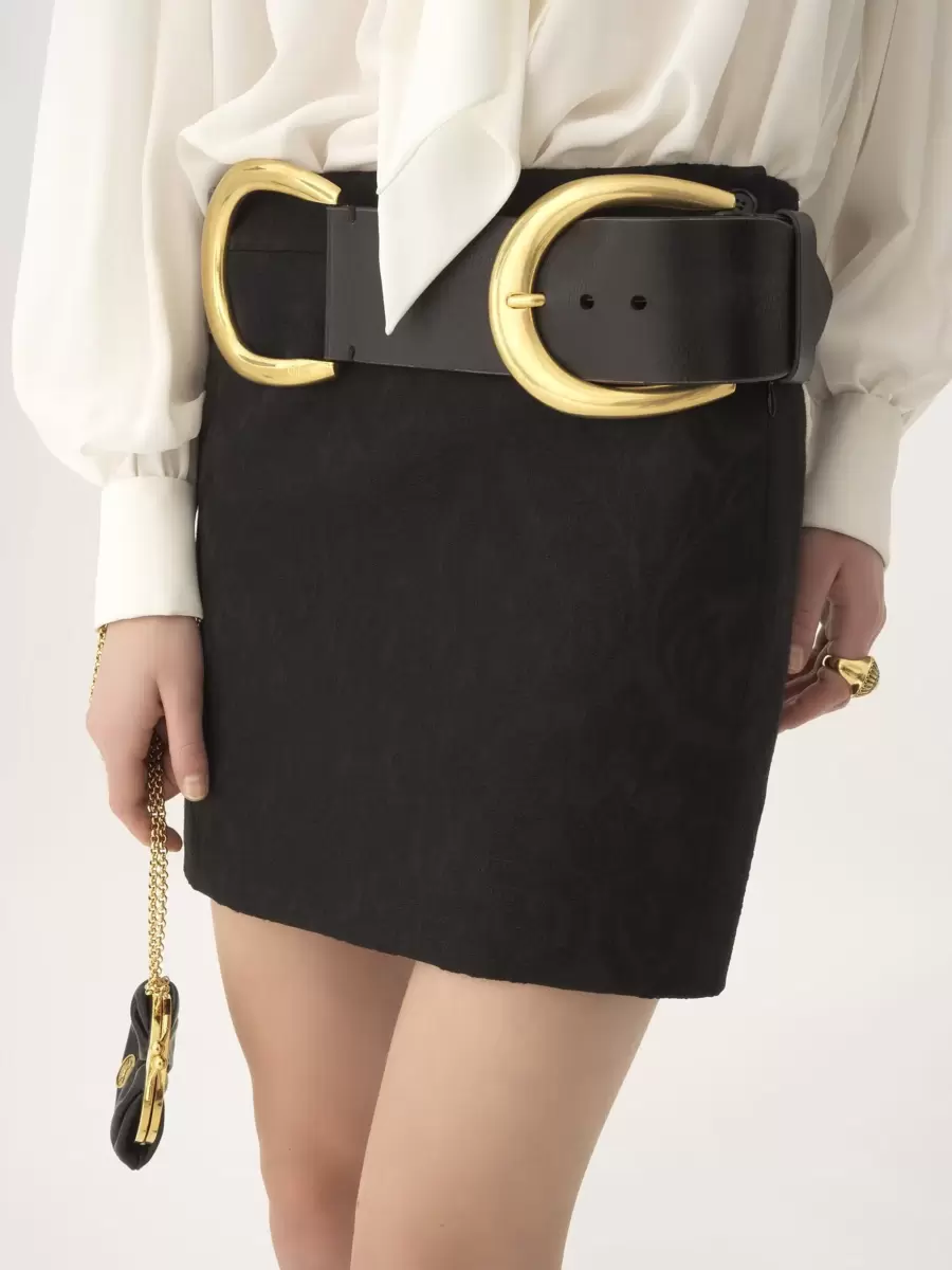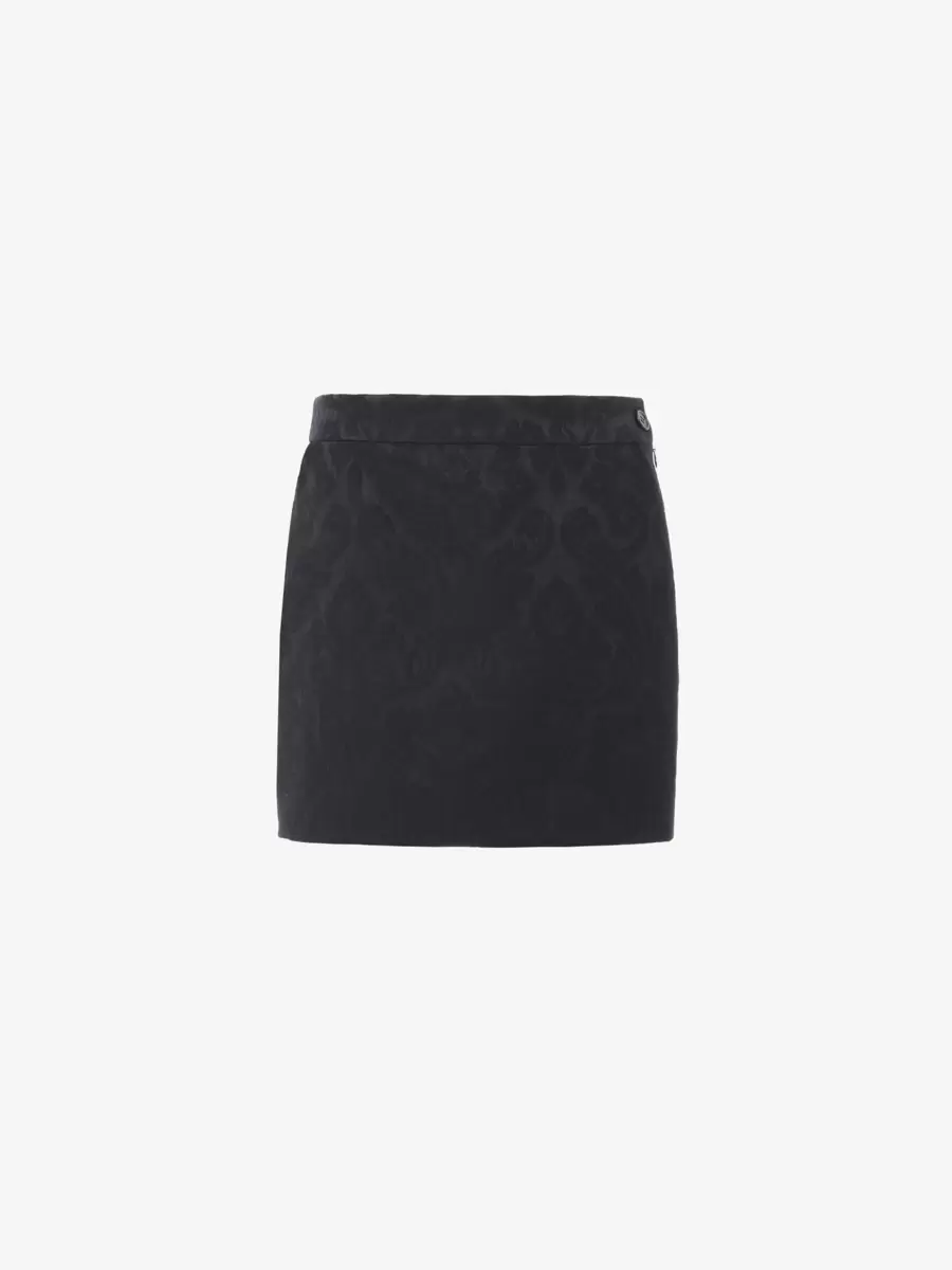 Süslü yün karışımlı jakarlı, örgülü düğmeli düz mini etek.