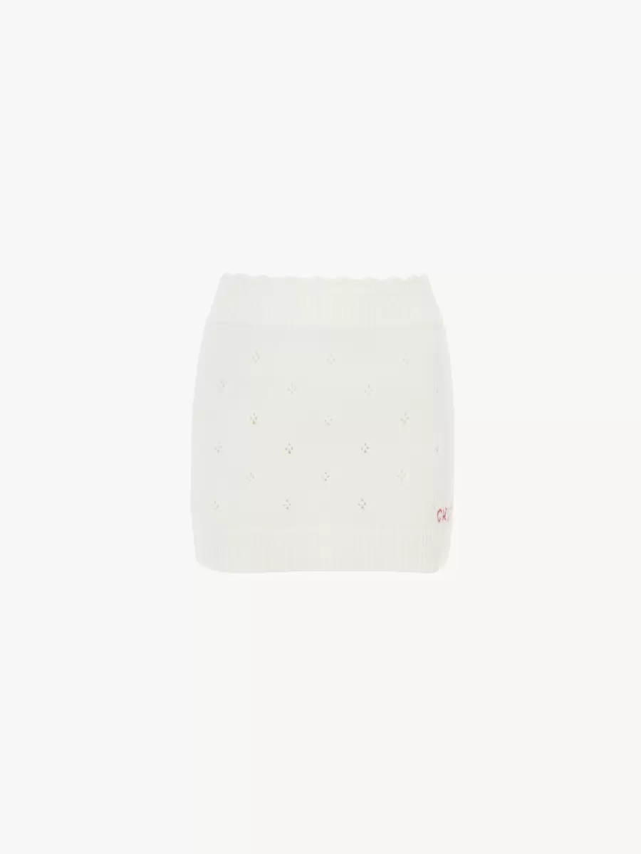 Açık iş motifli, düşük etkili kalın yün ve kaşmir örgülü, dar kesim mini etek. Bel kısmı taraklı, nervürlü kenarlar ve etek ucunda Chloé logosu işlemesi bulunmaktadır.