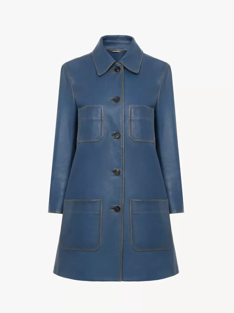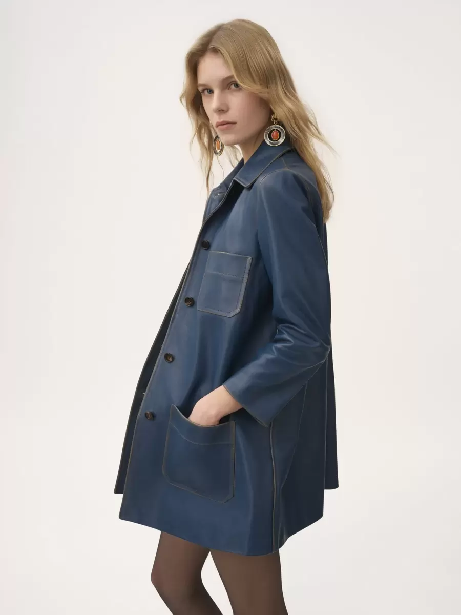 Dikişleri patina detaylı, ağır dana derisinden tek düğmeli kaban. Yama cepler ve oyma boynuz düğmeler bu parçayı tamamlıyor.