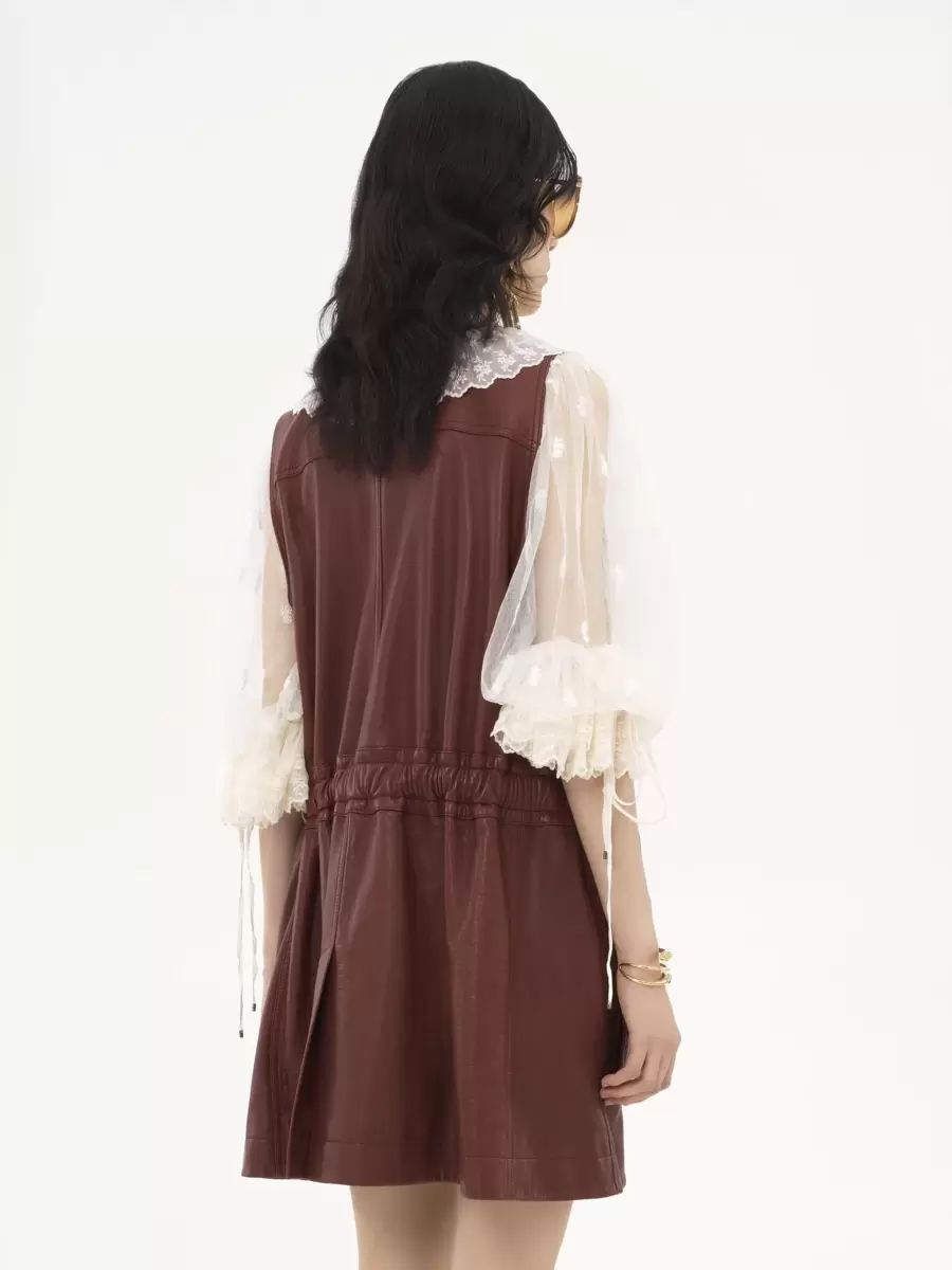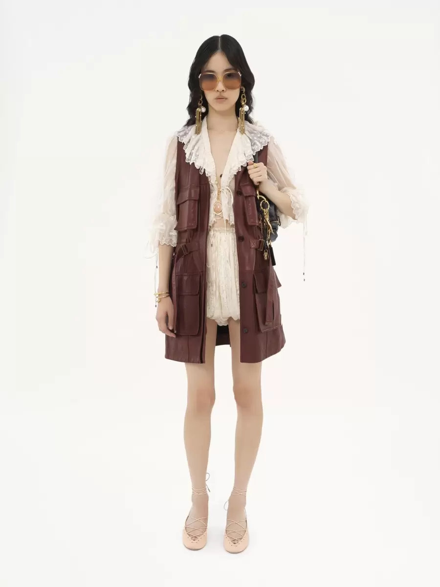 Büyük kapaklı ceplere, oyma boynuz düğmelere ve altın tonlarında metal uçlarla tamamlanmış entegre bir kemere sahip, plongé klasik deriden yapılmış kemerli, kullanışlı yelek. Altın metal Chloé logo üçgeni sol cepleri işaretler.