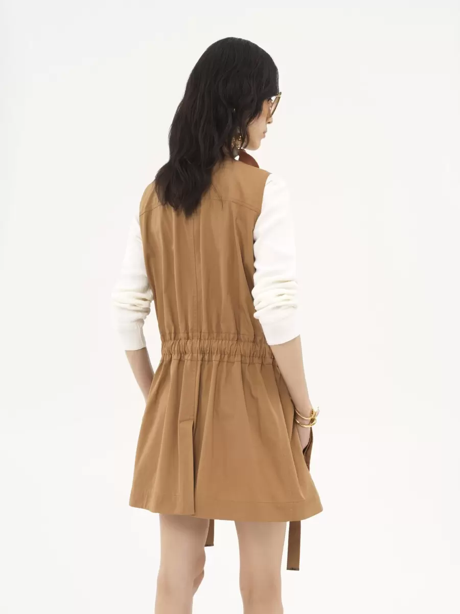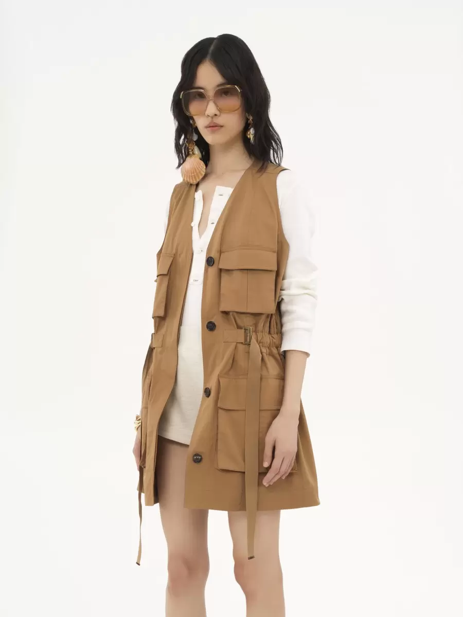 Hafif organik pamuklu gabardinden yapılmış, büyük kapaklı ceplere, oyma boynuz düğmelere ve altın tonlarında metal uçlarla tamamlanmış entegre bir kemere sahip, kemerli, kullanışlı yelek. Sol cepte altın metal Chloé logo üçgeni bulunur.