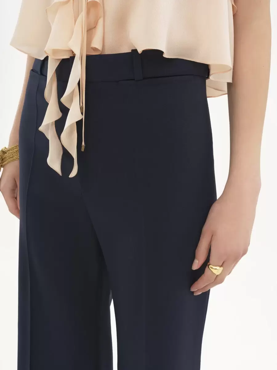 Düşük etkili ikonik esnek yünden yapılmış, ütülenmiş ön kırışıklıklarla tamamlanmış, kloş, özel dikim pantolon.