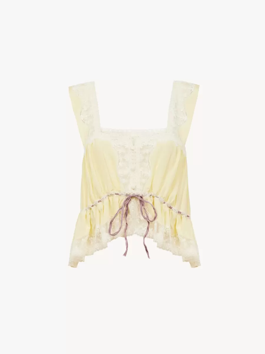 Dantel süslemeli, kumaş kaplı düğmeli ve bağcıklı bel kısmı olan, yumuşak ipek habotai kumaştan kare yakalı kısa üst.
