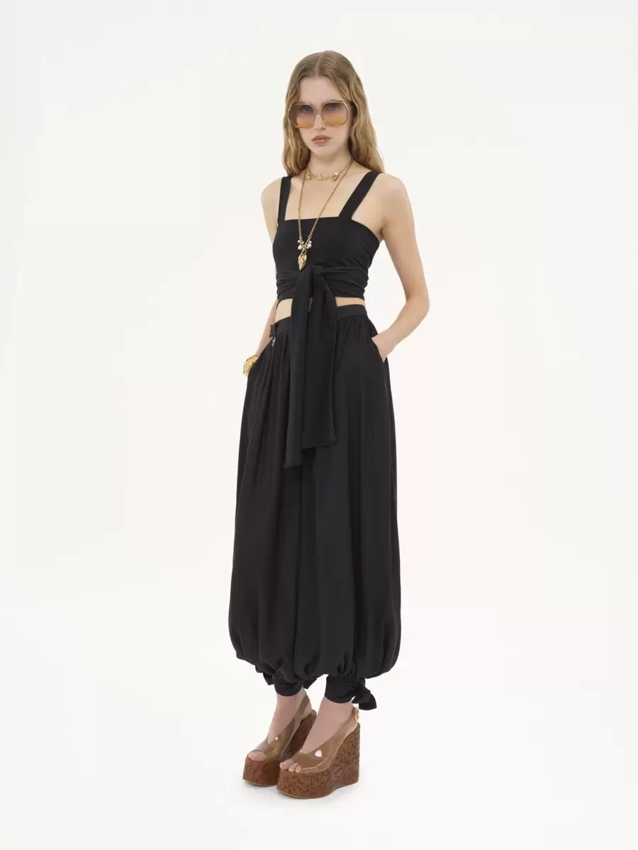 Ayrı bir şort astarına sahip, hafif ipek şarmöz kumaştan, akışkan pileli pantolon. Kısa kesim, kumaş kaplı düğmelerle detaylandırılmış bileklerde toplanmıştır. Altın tonlu D halkası sağ kalçayı işaretler.