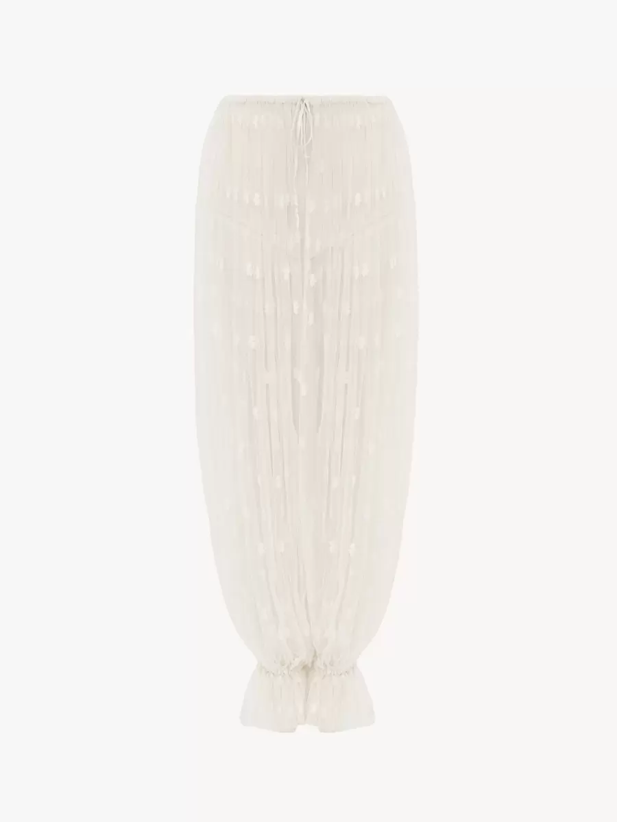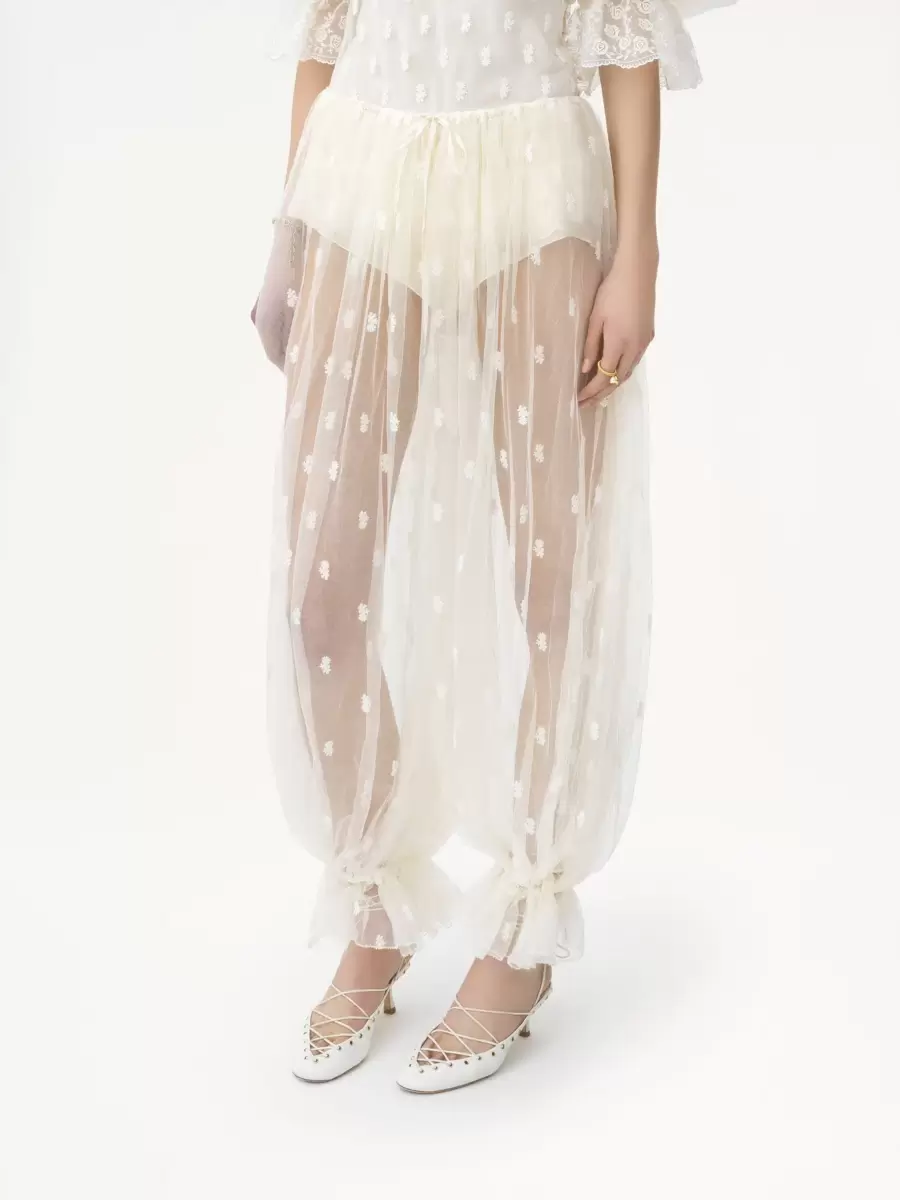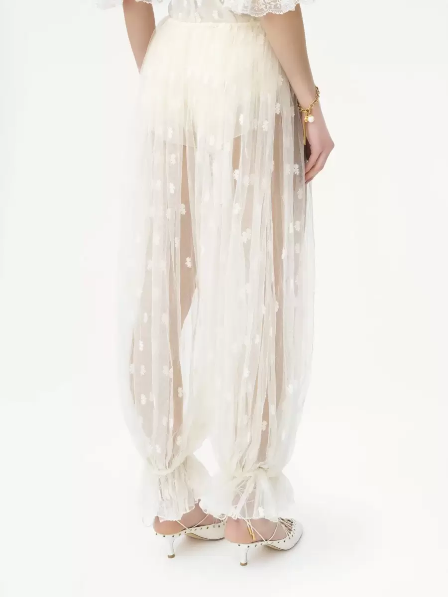 Maison mirasından esinlenen işlemeli dantel kumaştan, ayrı bir ipek karışımı şort astarı ve büzgülü bilek kısımları bulunan akışkan bağcıklı pantolon.