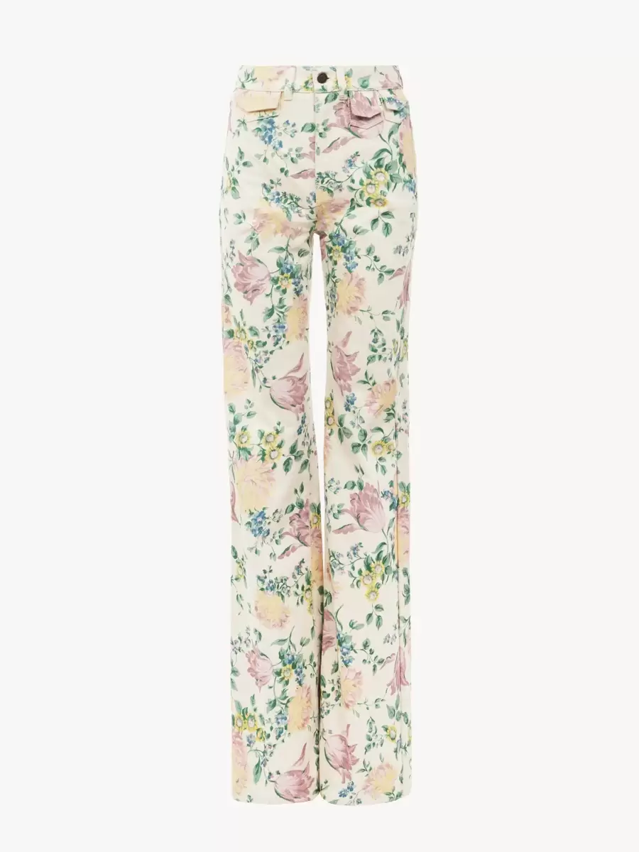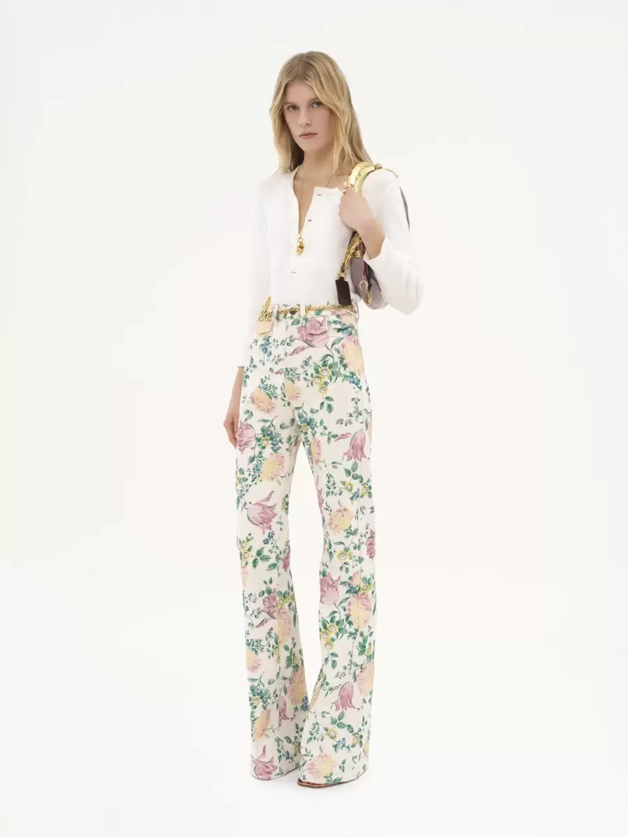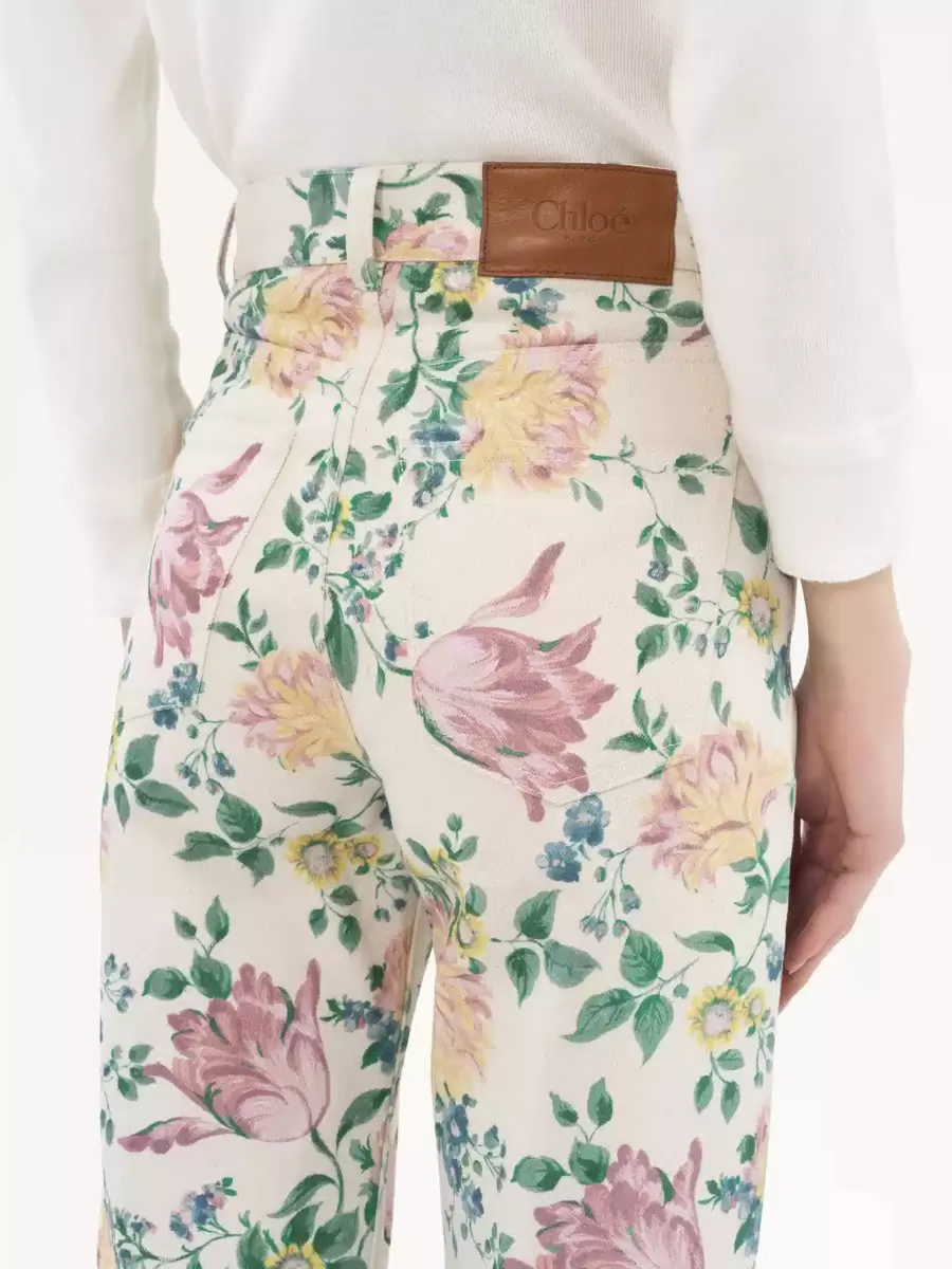 Maison’un mirasından ilham alan boyalı efektli, tamamı çiçek desenli organik pamuklu denimden yapılmış, yüksek bel, geniş paçalı kot pantolon. Mini kapaklı cepler bel kısmını detaylandırır.