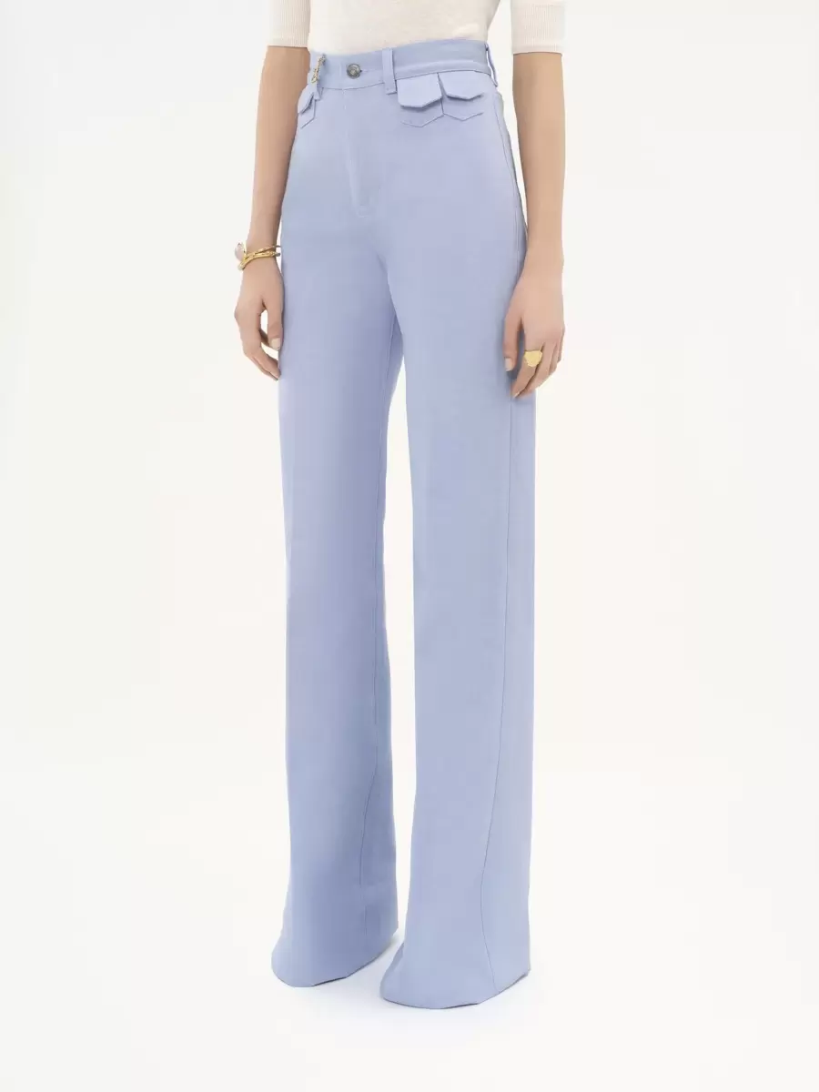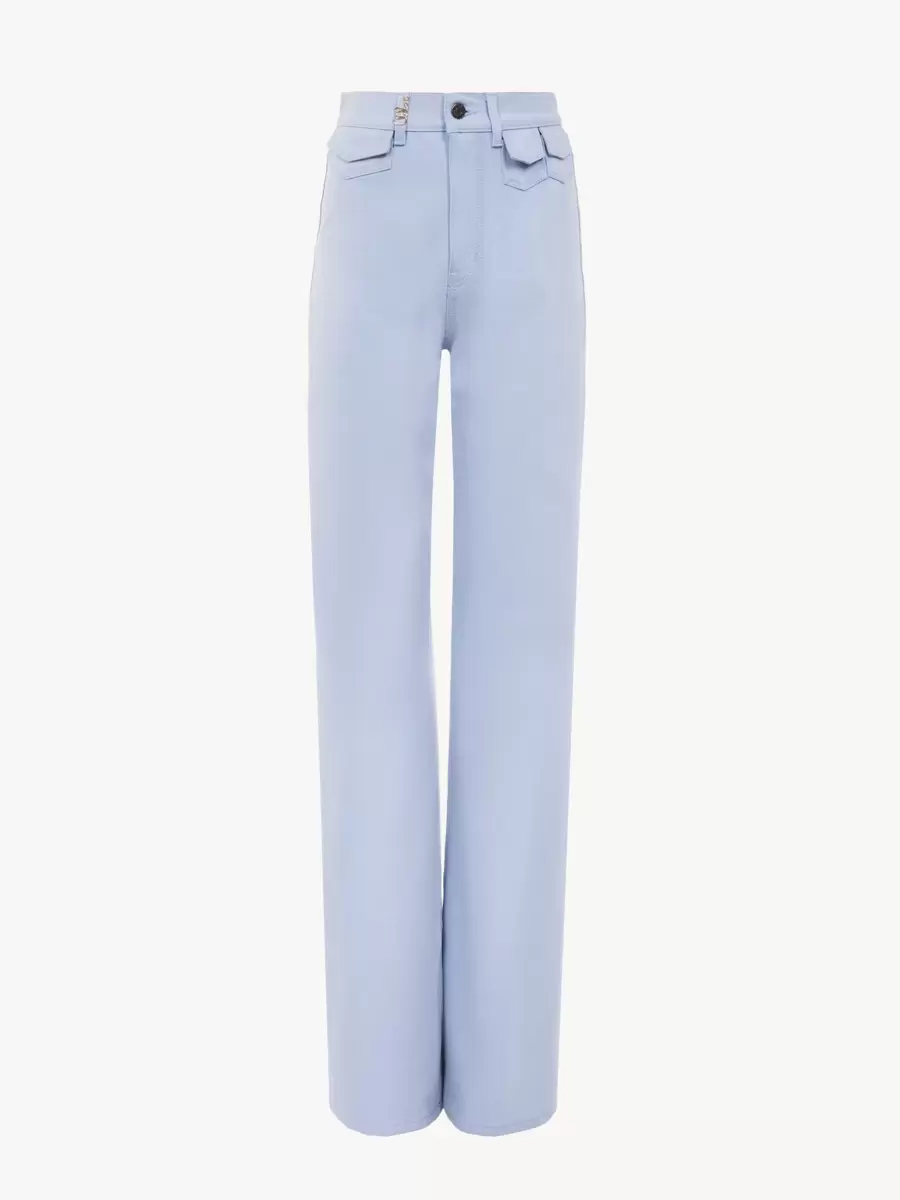 Belinde mini kapaklı cepleri olan, parça boyalı organik pamuklu denimden yapılmış, yüksek bel, İspanyol paça pantolon.