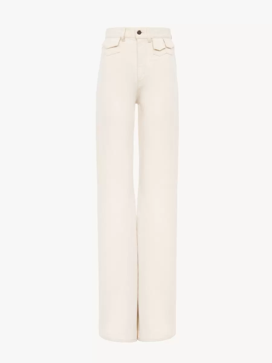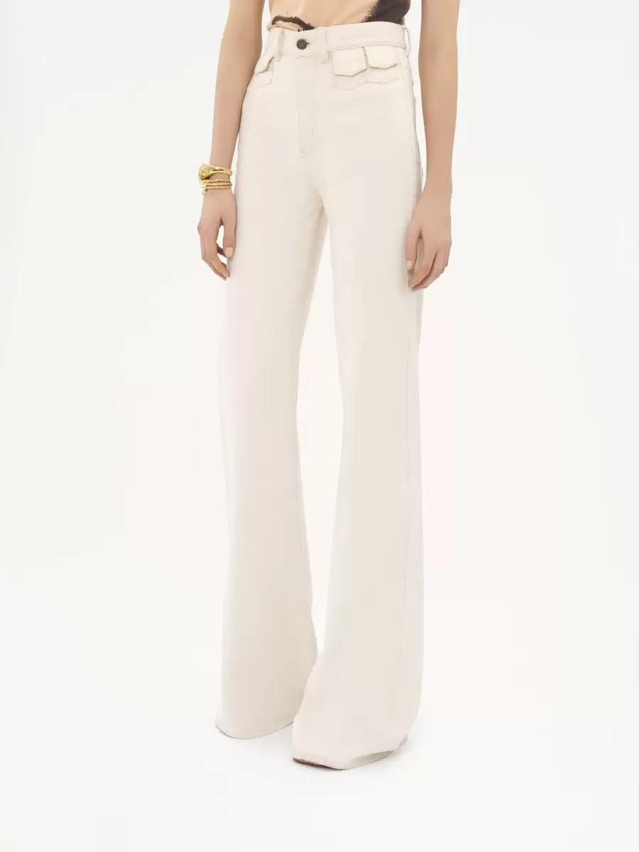Belinde mini kapaklı cepleri olan organik pamuklu denimden yüksek bel kloş pantolon.