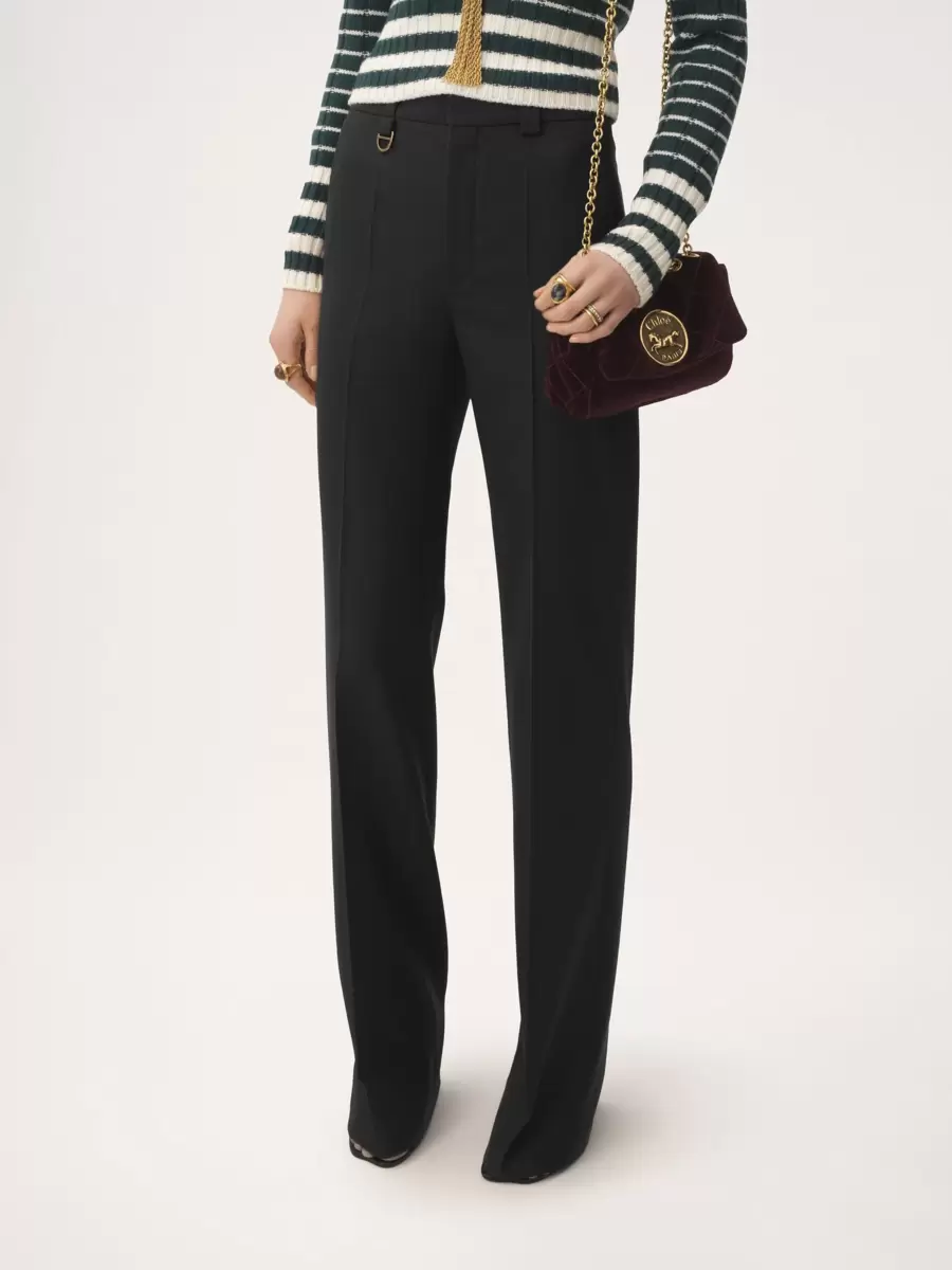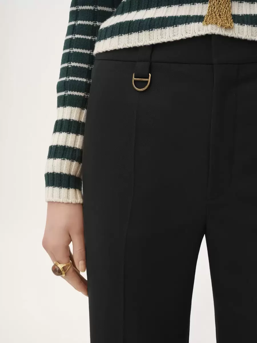 Düşük etkili yün taneli toz kumaştan yapılmış, düz paça, erkek çocuk tarzı özel dikim pantolon, ön kısımda ütülenmiş kırışıklıklar ve sağ kalçada altın tonlarında D halkası ile tamamlanmıştır.