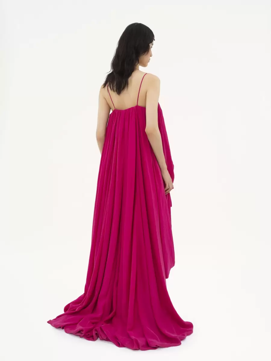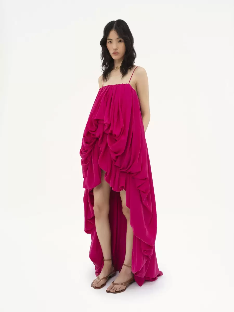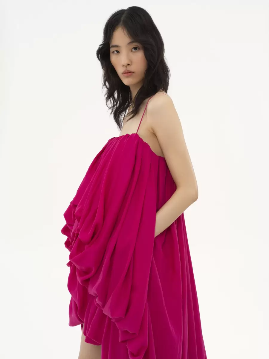 Yıkanmış ipek ponje kumaştan, ince askıları toplanmış, dalgalı bir silüetle birleştiren, yüksek-alçak kolsuz tulum.