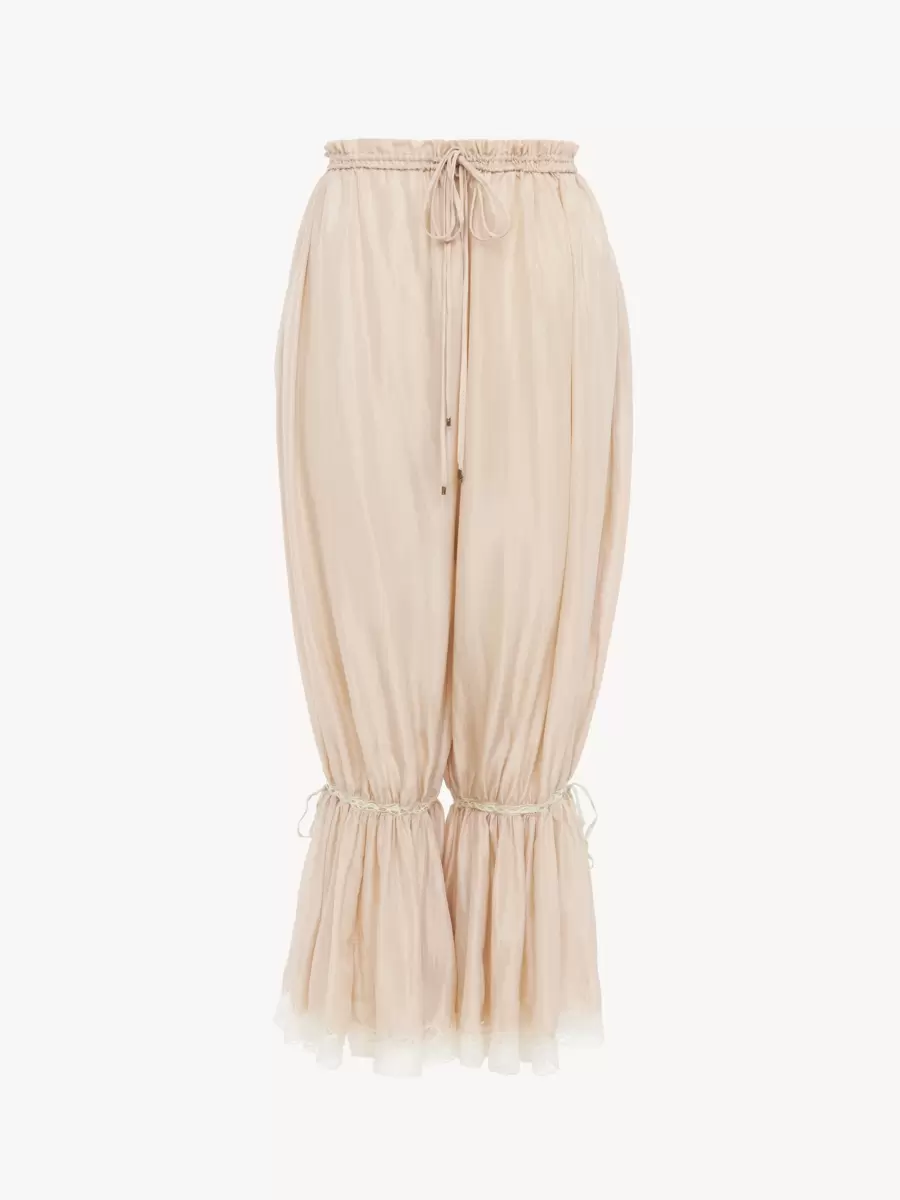 Ayrı bir şort astarı bulunan yıkanmış ipek ponje kumaştan, akışkan kesim pantolon. Diz altından bağcıklarla daraltılan pantolon, etek ucunda dantel bir şerit ve altın tonlarında metal uçlarla detaylandırılmış bağcıklı bir bel ile donatılmıştır.