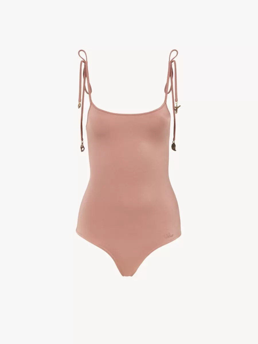 Parlak esnek jarse kumaştan tek parça mayo. İnce askılar omuzlarda düğümlenmiş ve altın tonlarında tığlarla detaylandırılmıştır.