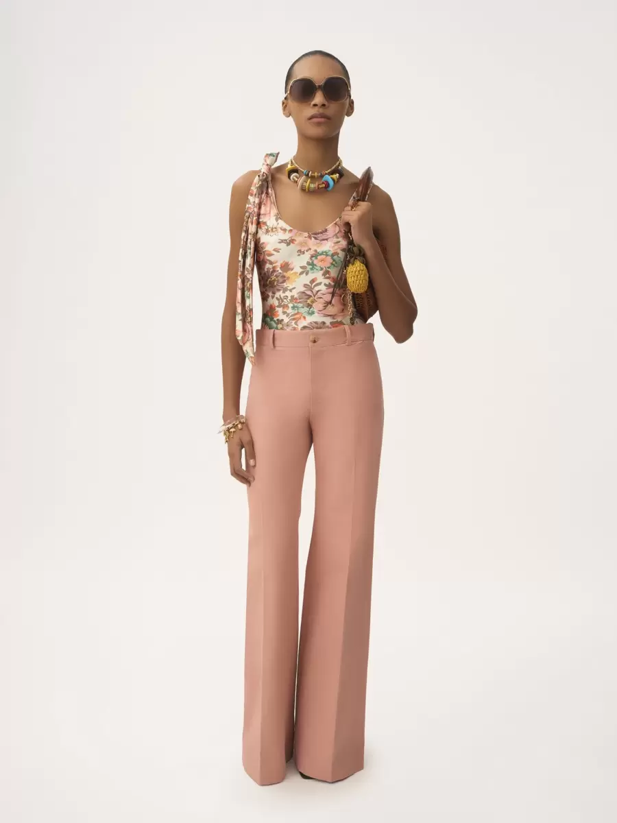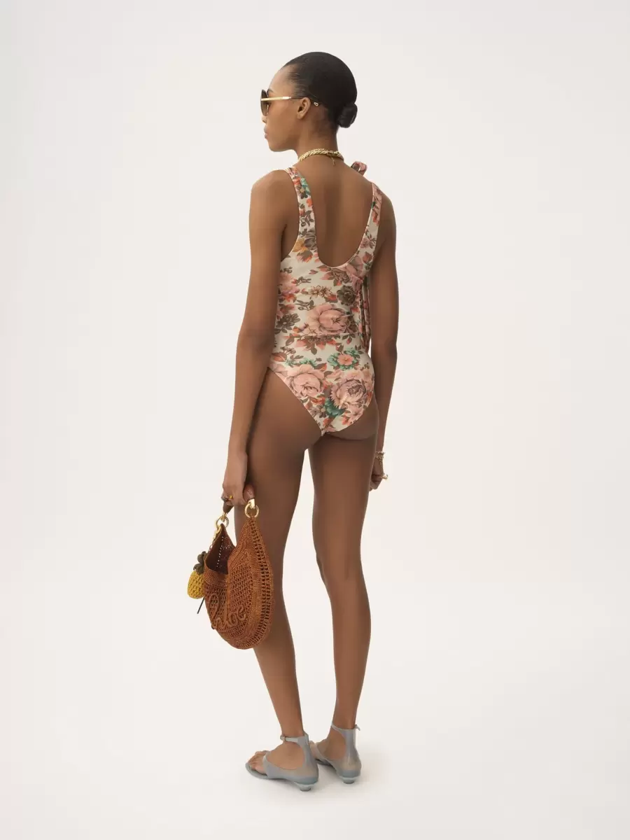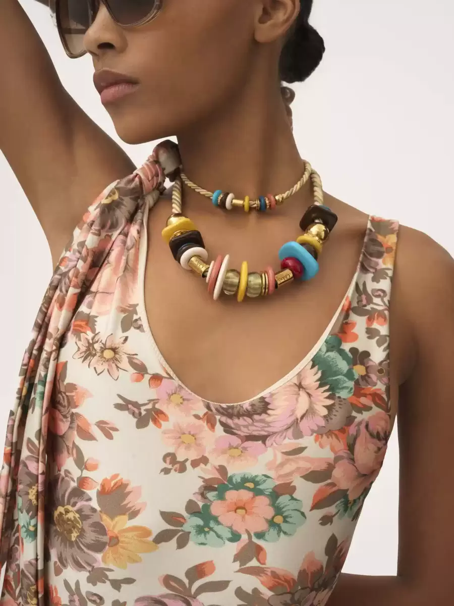 Parlak esnek naylondan, markanın mirasından ilham alan çiçek desenli, yuvarlak yakalı tek parça mayo. Sağ askı omuzda düğümlenirken, sol kalçada altın tonlarında bir Chloé logosu yer alıyor.