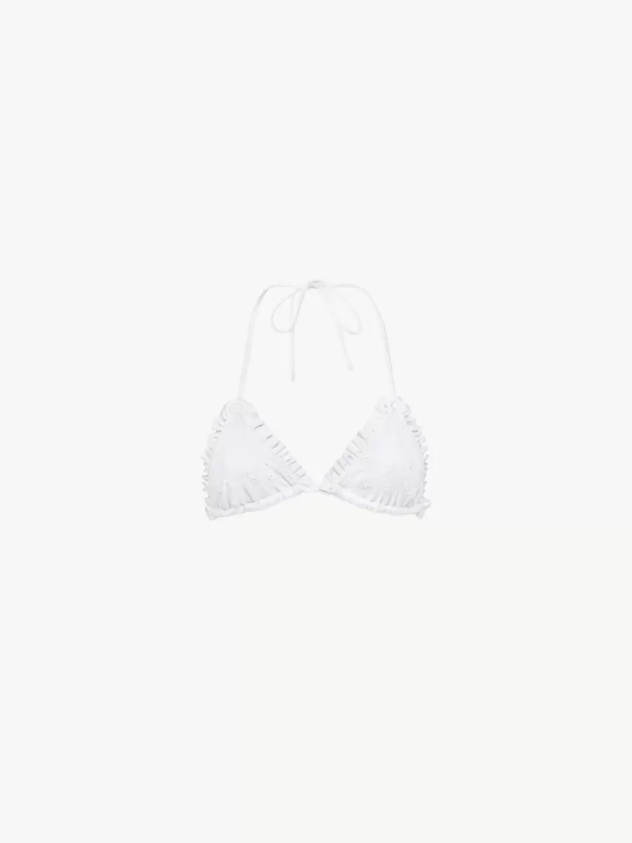 Esnek İngiliz nakışlı fırfırlı bikini üstü, boyundan ve arkadan bağcıklı.