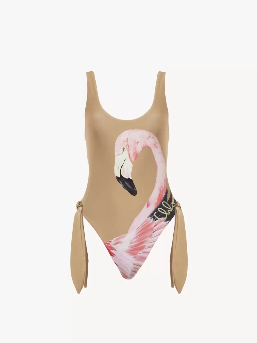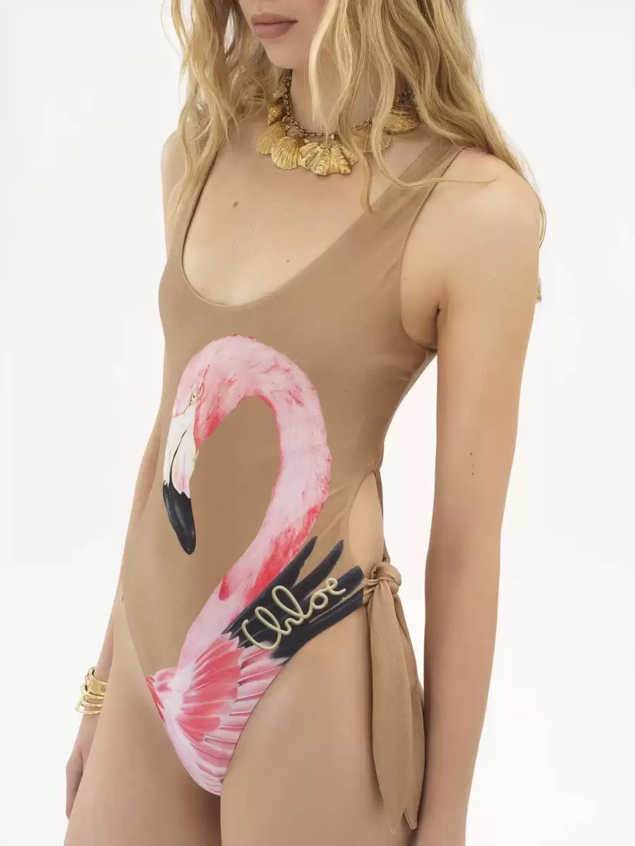 Parlak esnek jarse kumaştan, büyük flamingo desenli ve Chloé logolu tek parça mayo. Kalçaları detaylı bir şekilde kesilmiş ve düğümlü bağcıklar ile süslenmiştir.