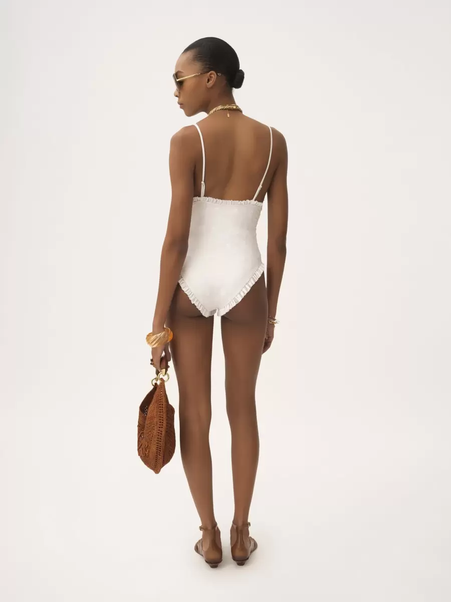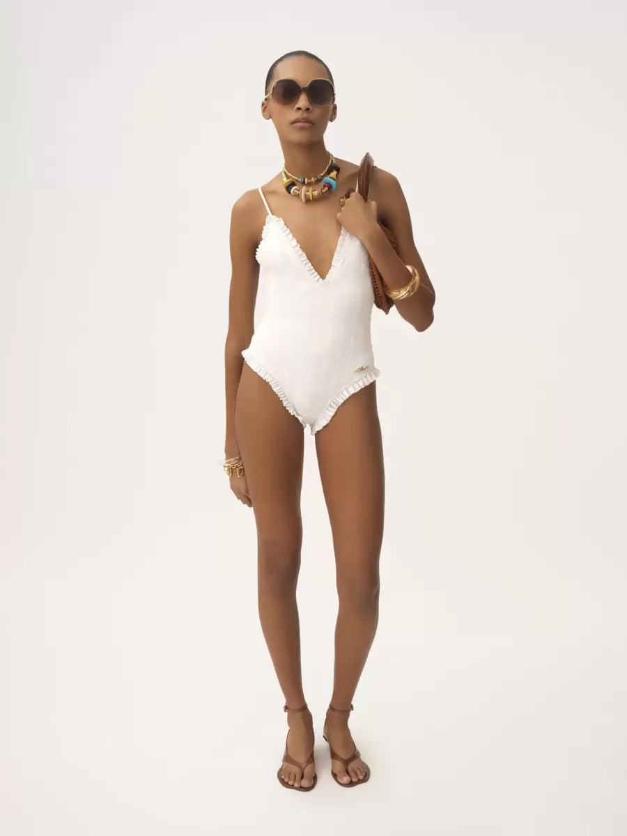 V yakalı, ince askılı ve fırfırlı kenarlı, streç İngiliz nakışlı tek parça mayo. Altın tonlu Chloé logo plakası sol kalçayı işaret ediyor.