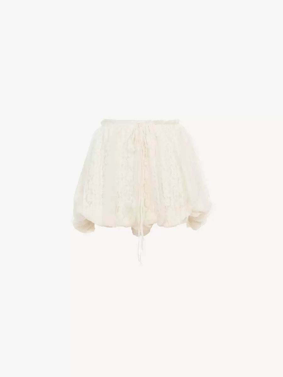 Organik ipek muselinden yapılmış, çiçekli dantel süslemeli ve ipek karışımı astarlı, akışkan, büzgülü mini şort. Bağcıklı bel kısmında altın tonlarında uçlarla tamamlanmış sarkan bağlar bulunur.