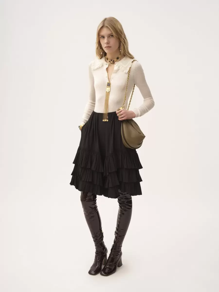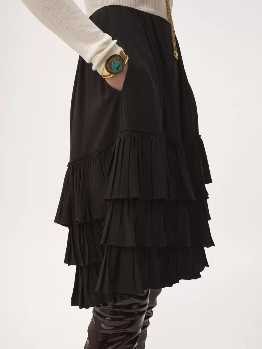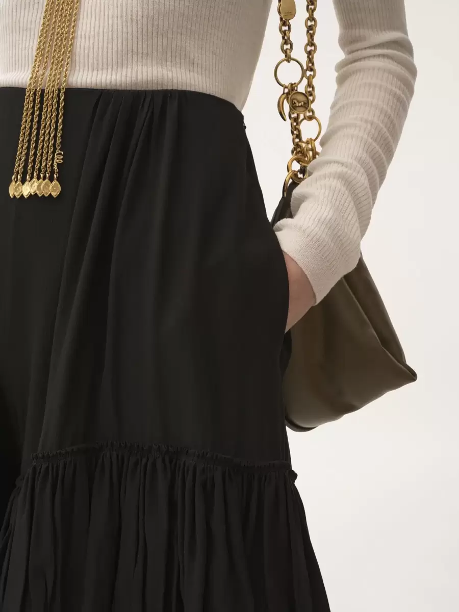 Organik ipek krep de şin kumaştan, akışkan, fırfırlı katlı şort.